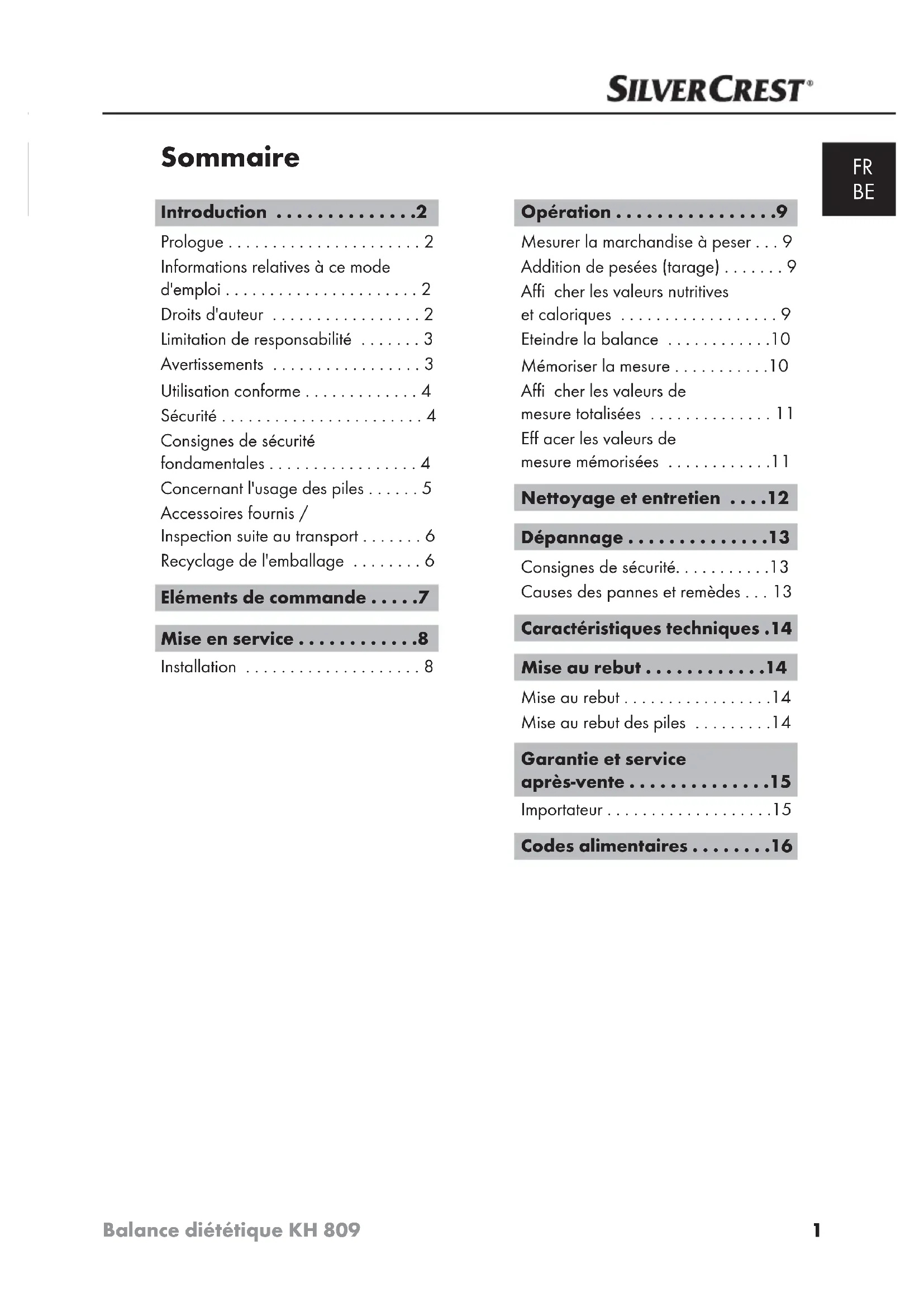 Garantie et service après-vente Cet appareil bénéfi cie de 3 ans de garantie à compter de la date d‘achat. L‘appareil a été fabriqué avec soin et consciencieusement contrôlé avant sa dis- tribution. Veuillez conserver le ticket de caisse en guise de preuve d‘achat. Si la garantie devait s‘appliquer, contactez par téléphone votre interlocuteur du service après-vente. Cette condition doit être respectée pour assurer l‘expédition gratuite de votre marchandise. La prestation de garantie s‘applique uniquement pour les erreurs de matériaux et de fabrication, pas pour les dommages de transport, les pièces d‘usure ou les dommages subis par les pièces fragiles, comme par ex. les interrupteurs ou les bat- teries. Le produit est exclusivement destiné à un usage privé et non commercial. La garantie est annulée en cas de manipulation incorrecte et inappropriée, d‘utilisation brutale et en cas d‘intervention qui n‘aurait pas été réalisée par notre centre de service après-vente agréé. Cette garantie ne constitue pas une restriction de vos droits légaux. La durée de la garantie n‘est pas prolongée par la garantie du fabricant. Ceci vaut également pour les pièces remplacées et réparées. Tous dommages et défauts présents dès l‘achat doivent être notifi és dès que le produit est déballé, et au plus tard deux jours après la date d‘achat. Toutes réparations survenant après la période sous garantie ne seront pas prises en charge. Kompernass Service France Tel.: 0800 808 825 e-mail: support.fr@kompernass.com Kompenass Service Belgium Te l .: 070350315 e-mail: support.be@kompernass.com Importateur KOMPERNASS GMBH BURGSTRASSE 21 44867 BOCHUM, GERMANY www.kompernass.com16 Codes alimentaires Balance diététique KH 809