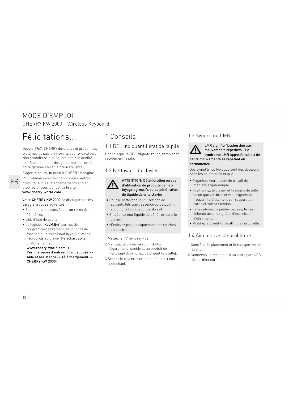 - Le logiciel "KeyM@n" permet de programmer librement les touches de fonction du clavier (sauf la veillle) et les raccourcis au clavier (téléchargez-le gratuitement sur www.cherry-world.com -> Périphériques d’entrée informatiques -> Aide et assistance -> Téléchargement -> CHERRY KW 2000). 1 Conseils