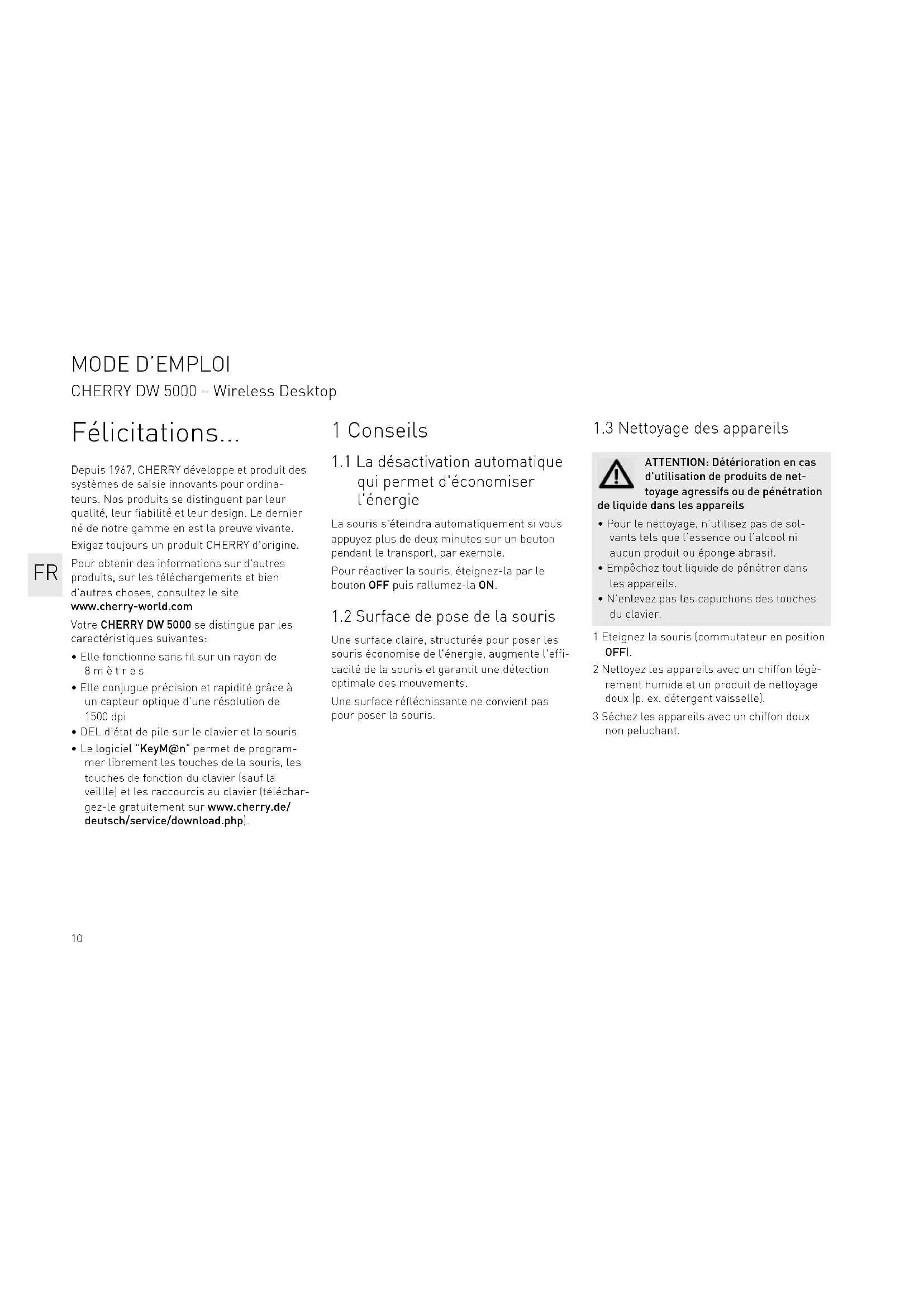 For use with Listed Personal Computers only! US10 Félicitations... Depuis 1967, CHERRY développe et produit des systèmes de saisie innovants pour ordina- teurs. Nos produits se distinguent par leur qualité, leur fiabilité et leur design. Le dernier né de notre gamme en est la preuve vivante. Exigez toujours un produit CHERRY d'origine. Pour obtenir des informations sur d'autres produits, sur les téléchargements et bien d'autres choses, consultez le site www.cherry-world.com Votre CHERRY DW 5000 se distingue par les caractéristiques suivantes:
