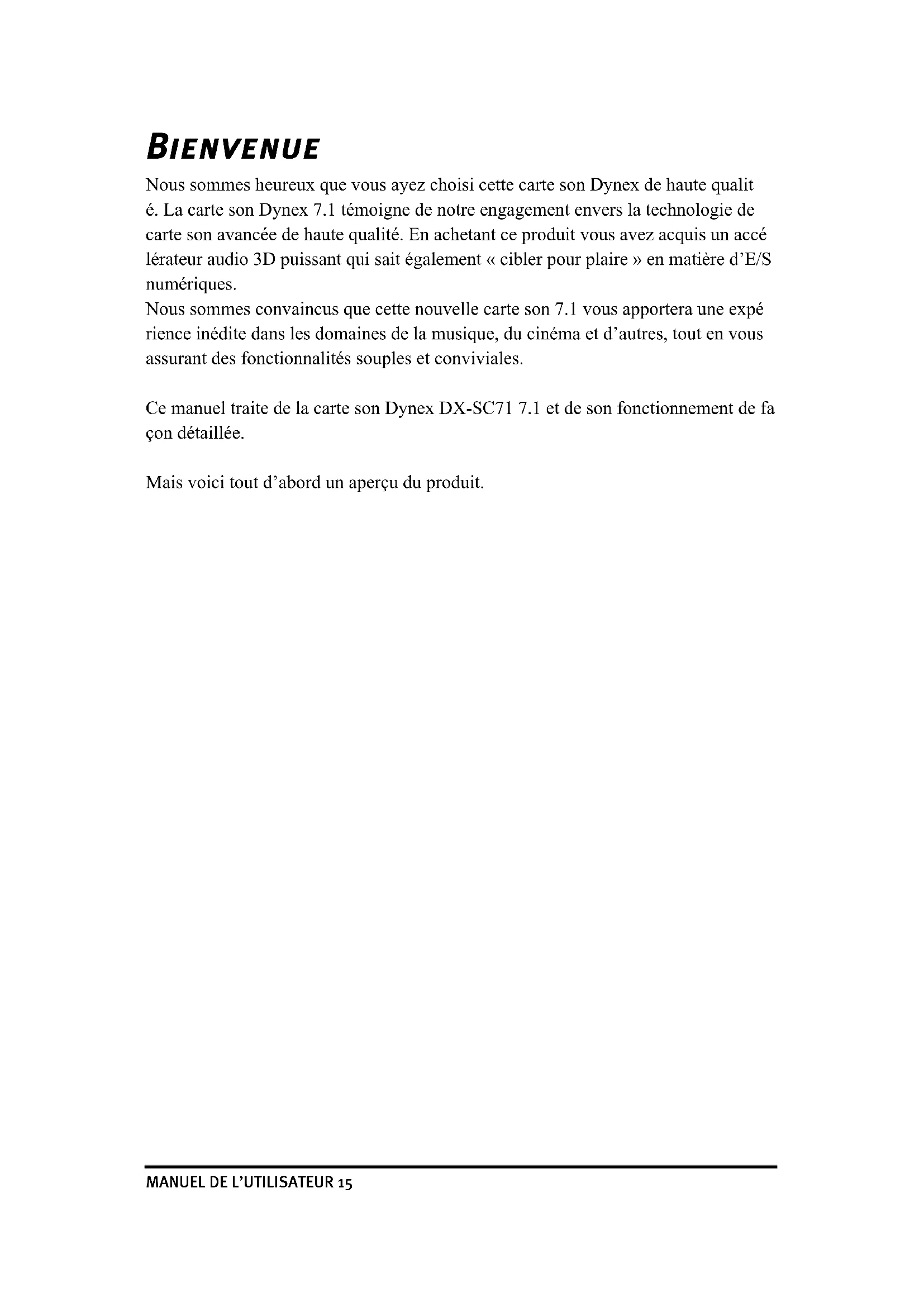 Ce manuel traite de la carte son Dynex DX-SC71 7.1 et de son fonctionnement de façon détaillée.