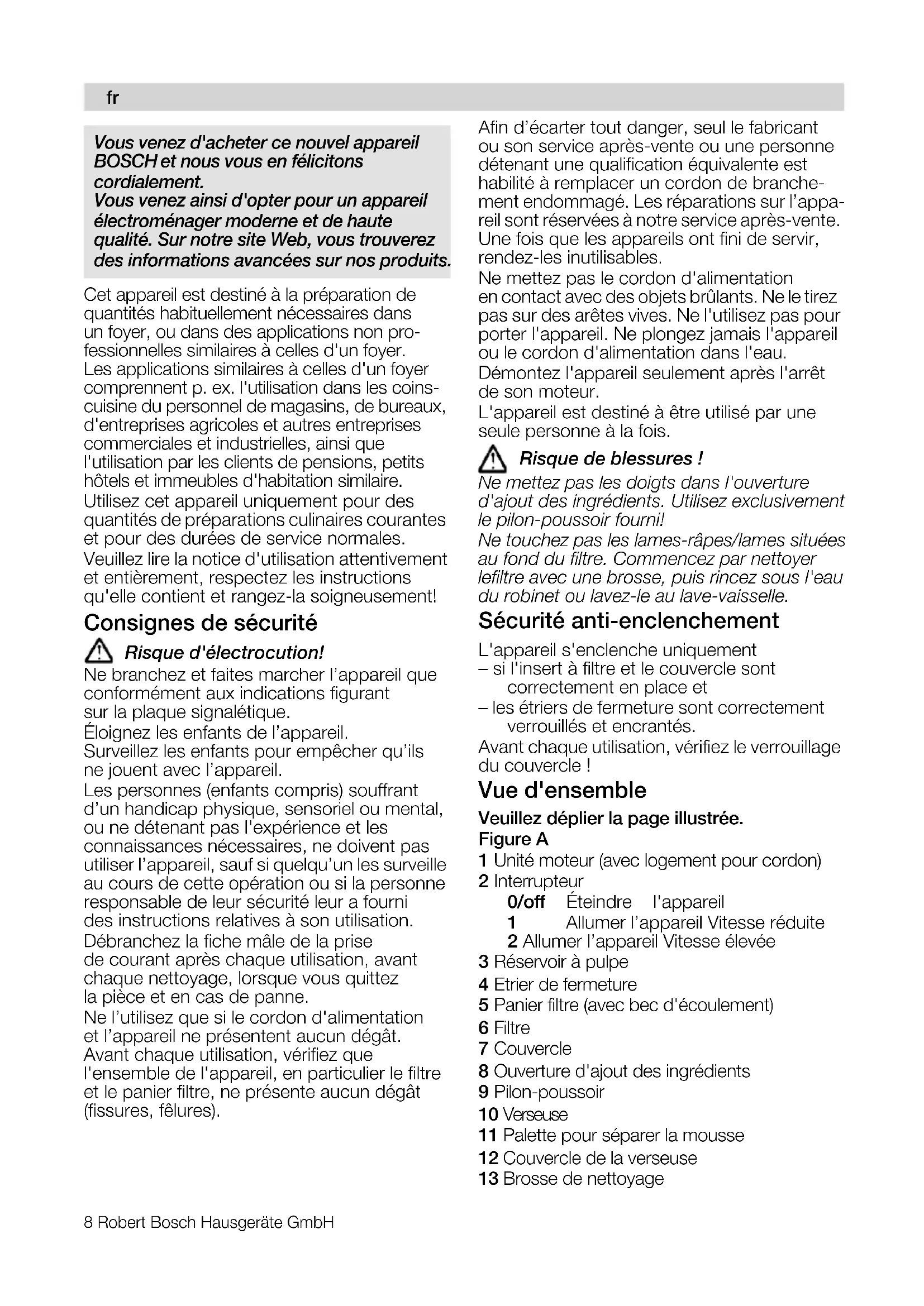 Subject to alterations.8 Robert Bosch Hausgeräte GmbH Cet appareil est destiné à la préparation de quantités habituellement nécessaires dans un foyer, ou dans des applications non pro- fessionnelles similaires à celles d'un foyer. Les applications similaires à celles d'un foyer comprennent p. ex. l'utilisation dans les coins- cuisine du personnel de magasins, de bureaux, d'entreprises agricoles et autres entreprises commerciales et industrielles, ainsi que l'utilisation par les clients de pensions, petits hôtels et immeubles d'habitation similaire. Utilisez cet appareil uniquement pour des quantités de préparations culinaires courantes et pour des durées de service normales. Veuillez lire la notice d'utilisation attentivement et entièrement, respectez les instructions qu'elle contient et rangez-la soigneusement! Consignes de sécurité oáëèìÉ=ÇD¨äÉÅíêçÅìíáçå> Ne branchez et faites marcher l’appareil que conformément aux indications figurant sur la plaque signalétique. Éloignez les enfants de l’appareil. Surveillez les enfants pour empêcher qu’ils ne jouent avec l’appareil. Les personnes (enfants compris) souffrant d’un handicap physique, sensoriel ou mental, ou ne détenant pas l'expérience et les connaissances nécessaires, ne doivent pas utiliser l’appareil, sauf si quelqu’un les surveille au cours de cette opération ou si la personne responsable de leur sécurité leur a fourni des instructions relatives à son utilisation. Débranchez la fiche mâle de la prise de courant après chaque utilisation, avant chaque nettoyage, lorsque vous quittez la pièce et en cas de panne. Ne l’utilisez que si le cordon d'alimentation et l’appareil ne présentent aucun dégât. Avant chaque utilisation, vérifiez que l'ensemble de l'appareil, en particulier le filtre et le panier filtre, ne présente aucun dégât (fissures, fêlures). Afin d’écarter tout danger, seul le fabricant ou son service après-vente ou une personne détenant une qualification équivalente est habilité à remplacer un cordon de branche- ment endommagé. Les réparations sur l’appa- reil sont réservées à notre service après-vente. Une fois que les appareils ont fini de servir, rendez-les inutilisables. Ne mettez pas le cordon d'alimentation en contact avec des objets brûlants. Ne le tirez pas sur des arêtes vives. Ne l'utilisez pas pour porter l'appareil. Ne plongez jamais l'appareil ou le cordon d'alimentation dans l'eau. Démontez l'appareil seulement après l'arrêt de son moteur. L'appareil est destiné à être utilisé par une seule personne à la fois. oáëèìÉ=ÇÉ=ÄäÉëëìêÉë=> kÉ=ãÉííÉò=é~ë=äÉë=ÇçáÖíë=Ç~åë=äDçìîÉêíìêÉ= ÇD~àçìí=ÇÉë=áåÖê¨ÇáÉåíëK=ríáäáëÉò=ÉñÅäìëáîÉãÉåí= äÉ=éáäçåJéçìëëçáê=Ñçìêåá> kÉ=íçìÅÜÉò=é~ë=äÉë=ä~ãÉëJêßéÉëLä~ãÉë=ëáíì¨Éë= ~ì=ÑçåÇ=Çì=ÑáäíêÉK=`çããÉåÅÉò=é~ê=åÉííçóÉê= äÉ ÑáäíêÉ=~îÉÅ=ìåÉ=ÄêçëëÉI=éìáë=êáåÅÉò=ëçìë=äDÉ~ì= Çì=êçÄáåÉí=çì=ä~îÉòJäÉ=~ì=ä~îÉJî~áëëÉääÉK Sécurité anti-enclenchement L'appareil s'enclenche uniquement – si l'insert à filtre et le couvercle sont correctement en place et – les étriers de fermeture sont correctement verrouillés et encrantés. Avant chaque utilisation, vérifiez le verrouillage du couvercle ! Vue d'ensemble Veuillez déplier la page illustrée. Figure A 1 Unité moteur (avec logement pour cordon) 2 Interrupteur 0/off Éteindre l'appareil 1 Allumer l’appareil Vitesse réduite 2 Allumer l’appareil Vitesse élevée 3 Réservoir à pulpe 4 Etrier de fermeture 5 Panier filtre (avec bec d'écoulement) 6 Filtre 7 Couvercle 8 Ouverture d'ajout des ingrédients 9 Pilon-poussoir 10 Verseuse 11 Palette pour séparer la mousse 12 Couvercle de la verseuse 13 Brosse de nettoyage