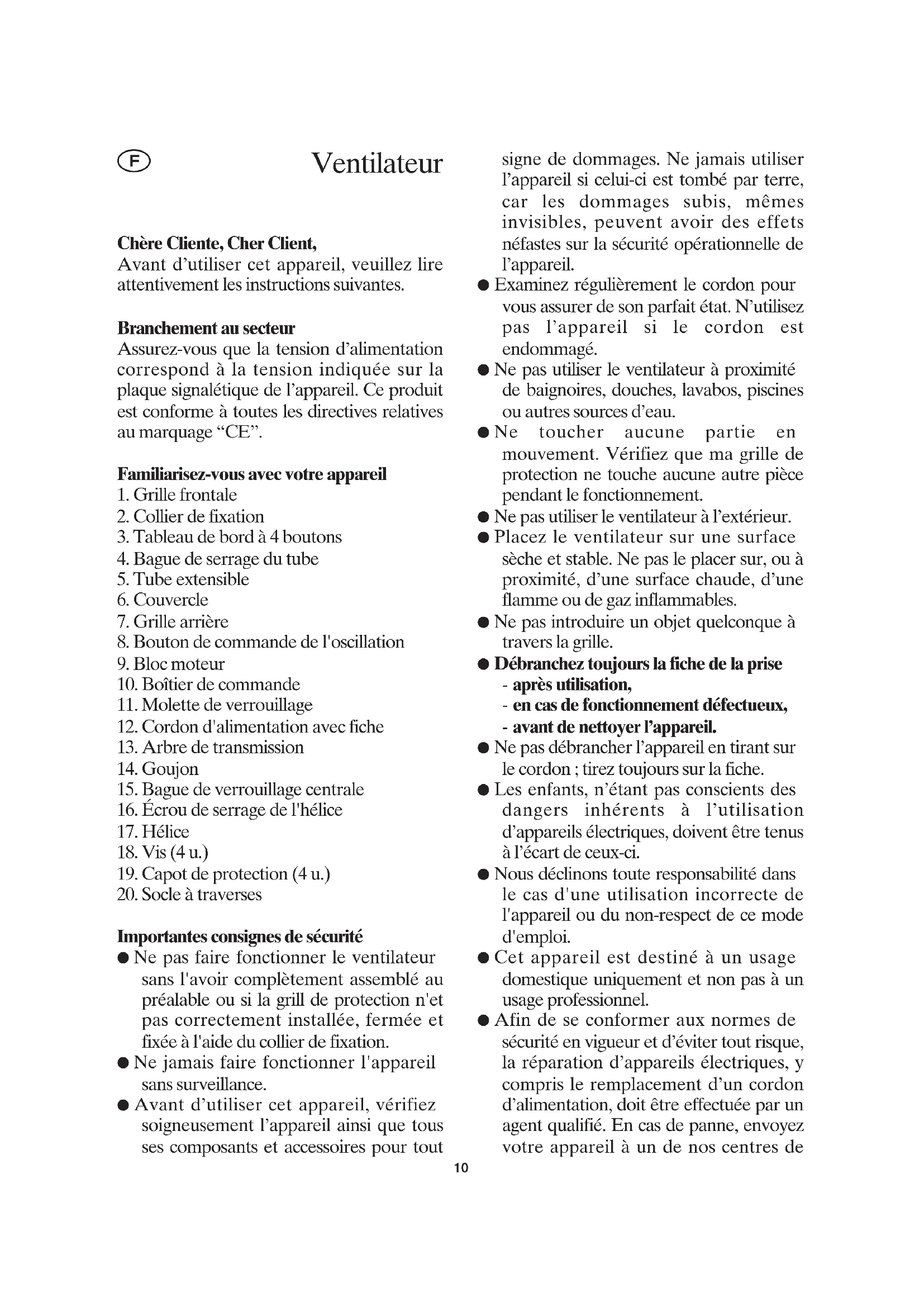 Importantes consignes de sécurité ● Ne pas faire fonctionner le ventilateur sans l'avoir complètement assemblé au préalable ou si la grill de protection n'et pas correctement installée, fermée et fixée à l'aide du collier de fixation. ● Ne jamais faire fonctionner l'appareil sans surveillance. ● Avant d’utiliser cet appareil, vérifiez soigneusement l’appareil ainsi que tous ses composants et accessoires pour tout signe de dommages. Ne jamais utiliser l’appareil si celui-ci est tombé par terre, car les dommages subis, mêmes invisibles, peuvent avoir des effets néfastes sur la sécurité opérationnelle de l’appareil. ● Examinez régulièrement le cordon pour vous assurer de son parfait état. N’utilisez pas l’appareil si le cordon est endommagé. ● Ne pas utiliser le ventilateur à proximité de baignoires, douches, lavabos, piscines ou autres sources d’eau. ● Ne toucher aucune partie en mouvement. Vérifiez que ma grille de protection ne touche aucune autre pièce pendant le fonctionnement. ● Ne pas utiliser le ventilateur à l’extérieur. ● Placez le ventilateur sur une surface sèche et stable. Ne pas le placer sur, ou à proximité, d’une surface chaude, d’une flamme ou de gaz inflammables. ● Ne pas introduire un objet quelconque à travers la grille. ● Débranchez toujours la fiche de la prise - après utilisation, - en cas de fonctionnement défectueux, - avant de nettoyer l’appareil. ● Ne pas débrancher l’appareil en tirant sur le cordon ; tirez toujours sur la fiche. ● Les enfants, n’étant pas conscients des dangers inhérents à l’utilisation d’appareils électriques, doivent être tenus à l’écart de ceux-ci. ● Nous déclinons toute responsabilité dans le cas d'une utilisation incorrecte de l'appareil ou du non-respect de ce mode d'emploi. ● Cet appareil est destiné à un usage domestique uniquement et non pas à un usage professionnel. ● Afin de se conformer aux normes de sécurité en vigueur et d’éviter tout risque, la réparation d’appareils électriques, y compris le remplacement d’un cordon d’alimentation, doit être effectuée par un agent qualifié. En cas de panne, envoyez votre appareil à un de nos centres de