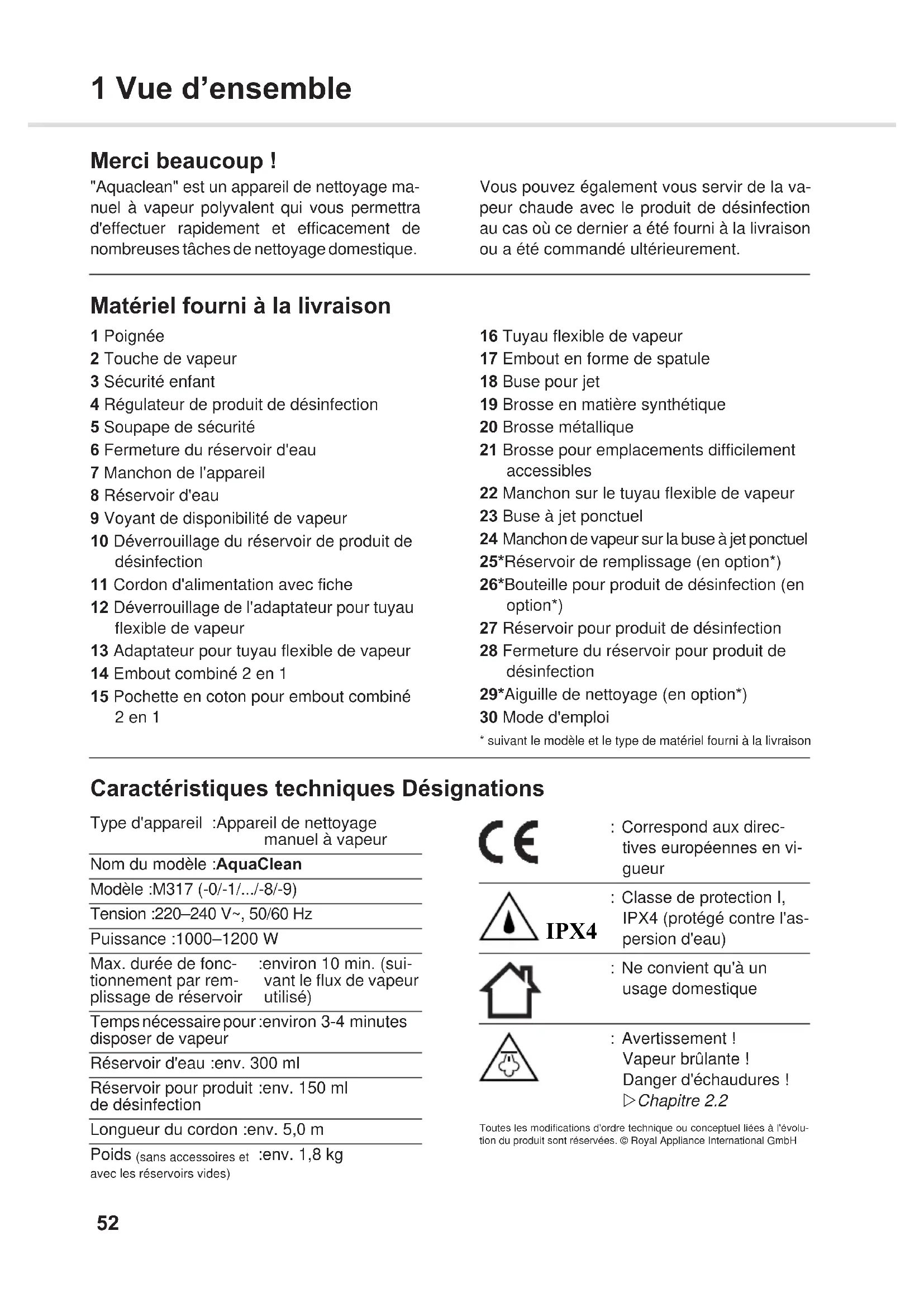 - suivant le modèle et le type de matériel fourni à la livraison Caractéristiques techniques Désignations Toutes les modifications d'ordre technique ou conceptuel liées à l'évolu-tion du produit sont réservées. © Royal Appliance International GmbH Type d'appareil :Appareil de nettoyage manuel à vapeur Nom du modèle :AquaClean Modèle :M317 (-0/-1/.../-8/-9) Tension :220–240 V~, 50/60 Hz Puissance :1000–1200 W Max. durée de fonc- tionnement par rem- plissage de réservoir :environ 10 min. (sui- vant le flux de vapeur utilisé) Temps nécessaire pour disposer de vapeur :environ 3-4 minutes Réservoir d'eau :env. 300 ml Réservoir pour produit de désinfection :env. 150 ml Longueur du cordon :env. 5,0 m Poids (sans accessoires et avec les réservoirs vides) :env. 1,8 kg : Correspond aux direc- tives européennes en vi- gueur : Classe de protection I, IPX4 (protégé contre l'as- persion d'eau) : Ne convient qu'à un usage domestique : Avertissement ! Vapeur brûlante ! Danger d'échaudures ! ZChapitre 2.2 IPX4 M317.book Seite 52 Dienstag, 20. Januar 2015 9:36 0953 1 Vue d’ensemble