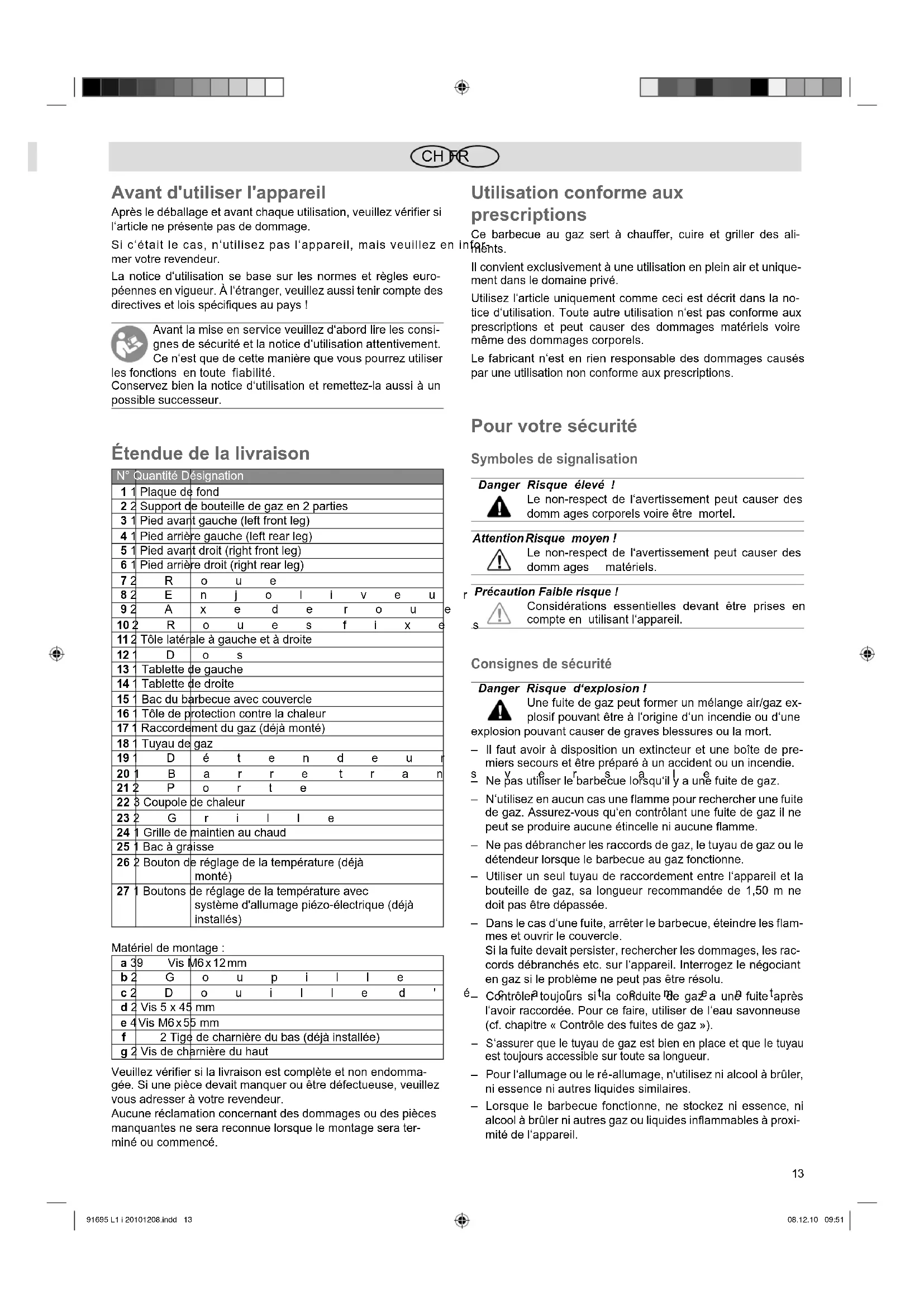CH FR Avant d'utiliser l'appareil Après le déballage et avant chaque utilisation, veuillez vérifier si l‘article ne présente pas de dommage. Si c‘était le cas, n‘utilisez pas l‘appareil, mais veuillez en infor- mer votre revendeur. La notice d‘utilisation se base sur les normes et règles euro- péennes en vigueur. À l‘étranger, veuillez aussi tenir compte des directives et lois spécifiques au pays ! Avant la mise en service veuillez d‘abord lire les consi- gnes de sécurité et la notice d‘utilisation attentivement. Ce n‘est que de cette manière que vous pourrez utiliser les fonctions en toute fiabilité. Conservez bien la notice d‘utilisation et remettez-la aussi à un possible successeur. Étendue de la livraison N° Quantité Désignation 1 1 Plaque de fond 2 2 Support de bouteille de gaz en 2 parties 3 1 Pied avant gauche (left front leg) 4 1 Pied arrière gauche (left rear leg) 5 1 Pied avant droit (right front leg) 6 1 Pied arrière droit (right rear leg) 7 2Roue 8 2Enjoliveur 9 2Axe de roue 10 2Roues fixes 11 2 Tôle latérale à gauche et à droite 12 1Dos 13 1 Tablette de gauche 14 1 Tablette de droite 15 1 Bac du barbecue avec couvercle 16 1 Tôle de protection contre la chaleur 17 1 Raccordement du gaz (déjà monté) 18 1 Tuyau de gaz 19 1Détendeur 20 1Barre transversale 21 2Porte 22 3 Coupole de chaleur 23 2Grille 24 1 Grille de maintien au chaud 25 1 Bac à graisse 26 2 Bouton de réglage de la température (déjà monté) 27 1 Boutons de réglage de la température avec système d'allumage piézo-électrique (déjà installés) Matériel de montage : a 39 Vis M6 x 12 mm b 2Goupille c 2Douille d'écartement d 2 Vis 5 x 45 mm e 4 Vis M6 x 55 mm f 2 Tige de charnière du bas (déjà installée) g 2 Vis de charnière du haut Veuillez vérifier si la livraison est complète et non endomma- gée. Si une pièce devait manquer ou être défectueuse, veuillez vous adresser à votre revendeur. Aucune réclamation concernant des dommages ou des pièces manquantes ne sera reconnue lorsque le montage sera ter- miné ou commencé. Utilisation conforme aux prescriptions Ce barbecue au gaz sert à chauffer, cuire et griller des ali- ments. Il convient exclusivement à une utilisation en plein air et unique- ment dans le domaine privé. Utilisez l‘article uniquement comme ceci est décrit dans la no- tice d‘utilisation. Toute autre utilisation n‘est pas conforme aux prescriptions et peut causer des dommages matériels voire même des dommages corporels. Le fabricant n‘est en rien responsable des dommages causés par une utilisation non conforme aux prescriptions. Pour votre sécurité Symboles de signalisation Danger Risque éle vé ! Le non-respect de l‘aver tissement peut causer des domm ages corporels voire être mortel. Attention Ris que moyen ! Le non-respect de l‘avertissement peut causer des domm ages matériels. Précaution Faible risque ! Considérations essentielles devant être prises en compte en utilisant l‘appareil. Consignes de sécurité Danger Risque d‘explosion ! Une fuite de gaz peut former un mélange air/gaz ex- plosif pouvant être à l‘origine d‘un incendie ou d‘une explosion pouvant causer de graves blessures ou la mort. – Il faut avoir à disposition un extincteur et une boîte de pre- miers secours et être préparé à un accident ou un incendie. – Ne pas utiliser le barbecue lorsqu‘il y a une fuite de gaz. – N‘utilisez en aucun cas une flamme pour rechercher une fuite de gaz. Assurez-vous qu‘en contrôlant une fuite de gaz il ne peut se produire aucune étincelle ni aucune flamme. – Ne pas débrancher les raccords de gaz, le tuyau de gaz ou le détendeur lorsque le barbecue au gaz fonctionne. – Utiliser un seul tuyau de raccordement entre l‘appareil et la bouteille de gaz, sa longueur recommandée de 1,50 m ne doit pas être dépassée. – Dans le cas d‘une fuite, arrêter le barbecue, éteindre les flam- mes et ouvrir le couvercle. Si la fuite devait persister, rechercher les dommages, les rac- cords débranchés etc. sur l‘appareil. Interrogez le négociant en gaz si le problème ne peut pas être résolu. – Contrôler toujours si la conduite de gaz a une fuite après l‘avoir raccordée. Pour ce faire, utiliser de l‘eau savonneuse (cf. chapitre « Contrôle des fuites de gaz »). – S‘assurer que le tuyau de gaz est bien en place et que le tuyau est toujours accessible sur toute sa longueur. – Pour l‘allumage ou le ré-allumage, n‘utilisez ni alcool à brûler, ni essence ni autres liquides similaires. – Lorsque le barbecue fonctionne, ne stockez ni essence, ni alcool à brûler ni autres gaz ou liquides inflammables à proxi- mité de l‘appareil. 91695 L1 i 20101208.indd 13 91695 L1 i 20101208.indd 13