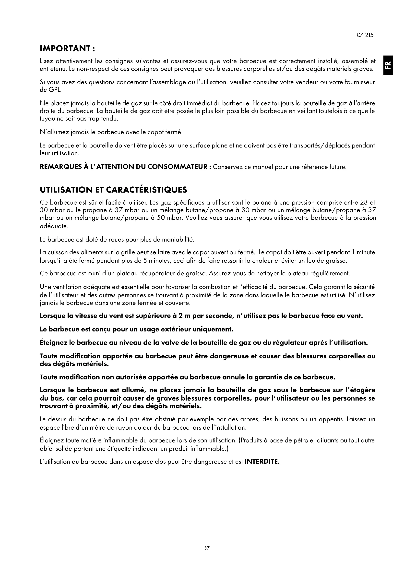 Ce barbecue est sûr et facile à utiliser. Les gaz spécifiques à utiliser sont le butane à une pression comprise entre 28 et 30 mbar ou le propane à 37 mbar ou un mélange butane/propane à 30 mbar ou un mélange butane/propane à 37 mbar ou un mélange butane/propane à 50 mbar. Veuillez vous assurer que vous utilisez votre barbecue à la pression adéquate. Le barbecue est doté de roues pour plus de maniabilité. La cuisson des aliments sur la grille peut se faire avec le capot ouvert ou fermé. Le capot doit être ouvert pendant 1 minute lorsqu’il a été fermé pendant plus de 5 minutes, ceci afin de faire ressortir la chaleur et éviter un feu de graisse. Ce barbecue est muni d’un plateau récupérateur de graisse. Assurez-vous de nettoyer le plateau régulièrement. Une ventilation adéquate est essentielle pour favoriser la combustion et l’efficacité du barbecue. Cela garantit la sécurité de l’utilisateur et des autres personnes se trouvant à proximité de la zone dans laquelle le barbecue est utilisé. N’utilisez jamais le barbecue dans une zone fermée et couverte. Lorsque la vitesse du vent est supérieure à 2 m par seconde, n’utilisez pas le barbecue face au vent. Le barbecue est conçu pour un usage extérieur uniquement. Éteignez le barbecue au niveau de la valve de la bouteille de gaz ou du régulateur après l’utilisation. Toute modification apportée au barbecue peut être dangereuse et causer des blessures corporelles ou des dégâts matériels. Toute modification non autorisée apportée au barbecue annule la garantie de ce barbecue. Lorsque le barbecue est allumé, ne placez jamais la bouteille de gaz sous le barbecue sur l’étagère du bas, car cela pourrait causer de graves blessures corporelles, pour l’utilisateur ou les personnes se trouvant à proximité, et/ou des dégâts matériels. Le dessus du barbecue ne doit pas être obstrué par exemple par des arbres, des buissons ou un appentis. Laissez un espace libre d’un mètre de rayon autour du barbecue lors de l’installation. Éloignez toute matière inflammable du barbecue lors de son utilisation. (Produits à base de pétrole, diluants ou tout autre objet solide portant une étiquette indiquant un produit inflammable.) L’utilisation du barbecue dans un espace clos peut être dangereuse et est INTERDITE. FR38