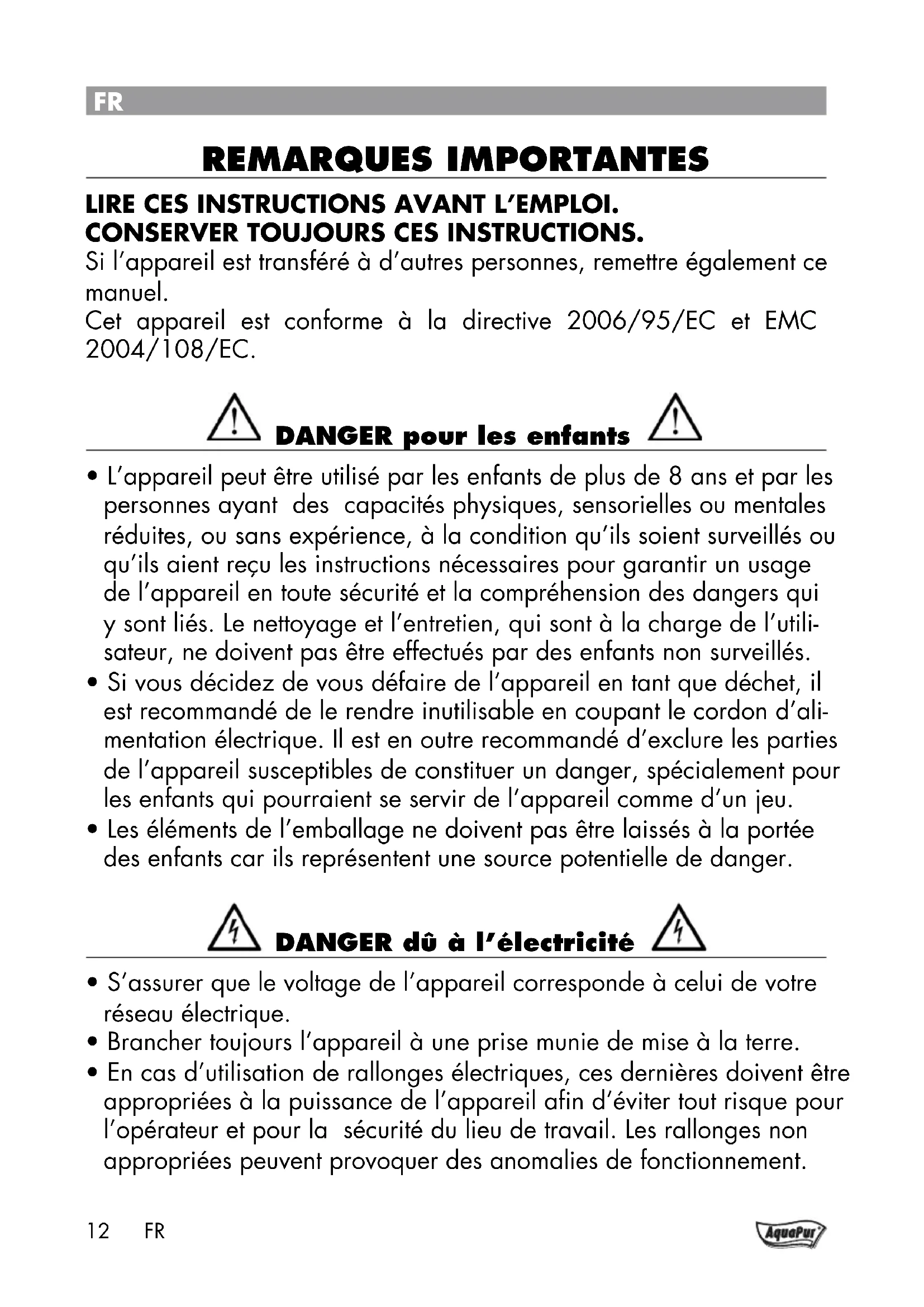 Lire CeS inSTruCTiOnS AVAnT L’empLOi. COnSerVer TOuJOurS CeS inSTruCTiOnS. Si l’appareil est transféré à d’autres personnes, remettre également ce manuel. Cet appareil est conforme à la directive 2006/95/EC et EMC 2004/108/EC.