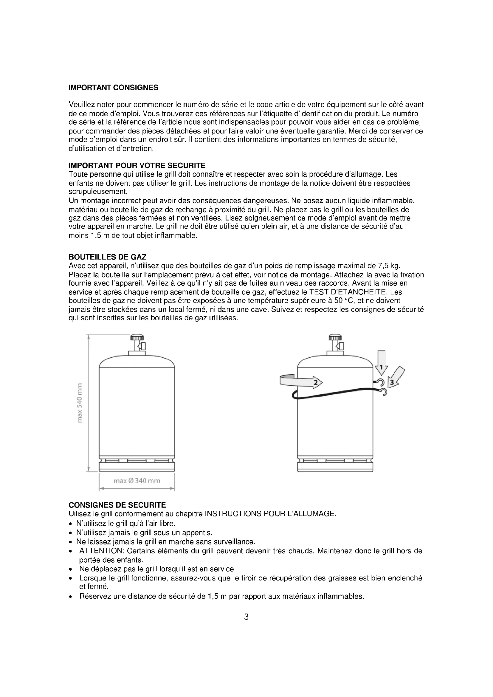 Avec cet apparéil, n'utilise que des bouteilles de gaz d'un poids de replissage maximal de 7,5 kg. Placez la bouteille sur l'emplacement prévu à cet effet, voir notice de montage. Attachez-la avec la fixation fournie avec l'appareil. Veillez à ce qu'il n'y ait pas de fuites au niveau des raccords. Avant la mise en service et après chaque remplacement de bouteille de gaz, effectuez le TEST D'ETANCHEITE. Les bouteilles de gaz ne doivent pas être exposées à une température supérieure à 50^ , et ne doivent jamais être stockées dans un local fermé, ni dans une cave. Suivez et respectez les consignes de sécurité qui sont inscrites sur les bouteilles de gaz utilisées.
