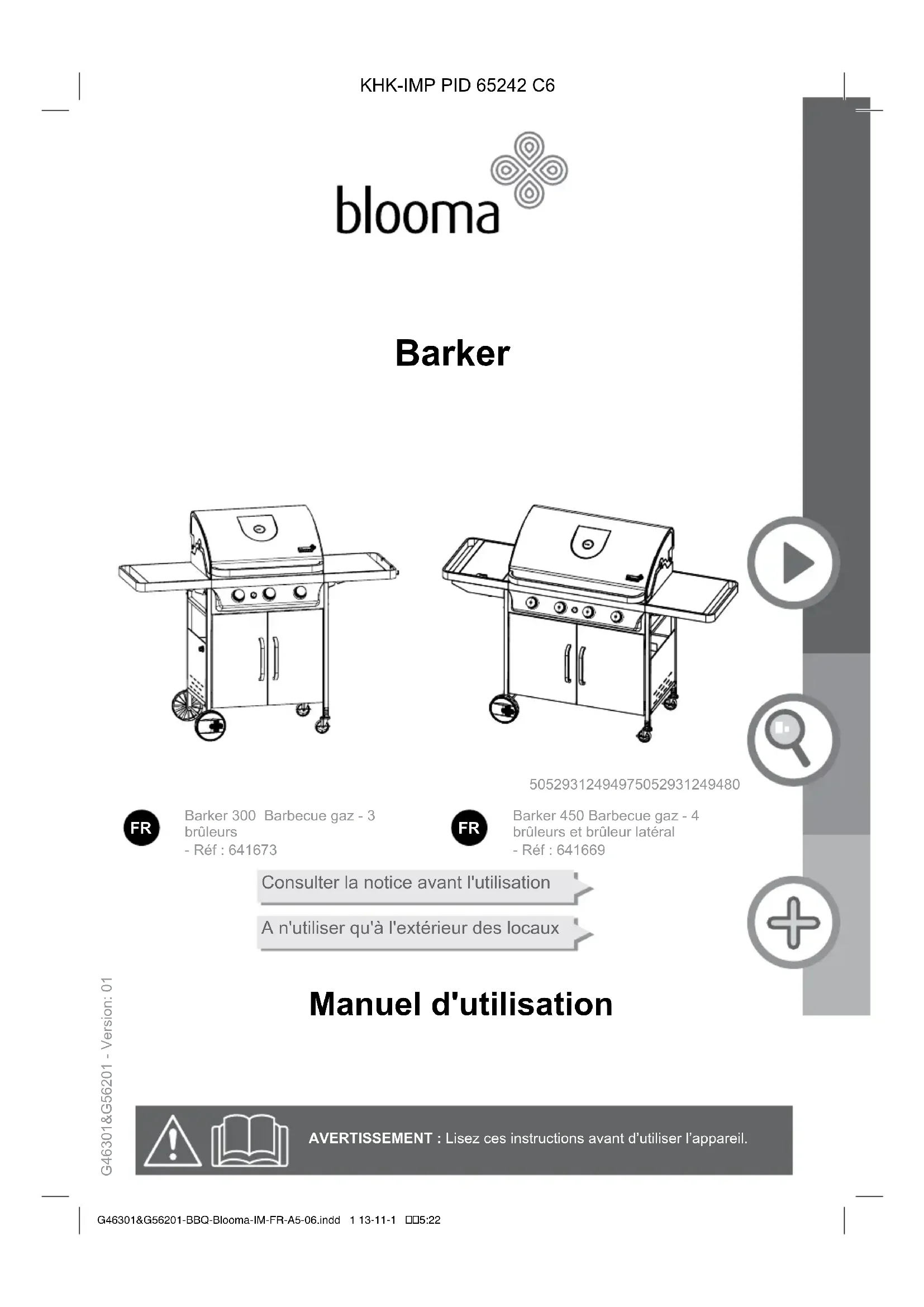 - Lors de l'allumage, le couvercle doit toujours être ouvert. Informations techniques et légales G46301&G56201-BBQ-Blooma-IM-FR-A5-06.indd 23 13-11-1 5:2224 Barker 300 Barbecue gaz - 3 brûleurs Barker 450 Barbecue gaz - 4 brûleurs et brûleur latéral Et dans le détail...