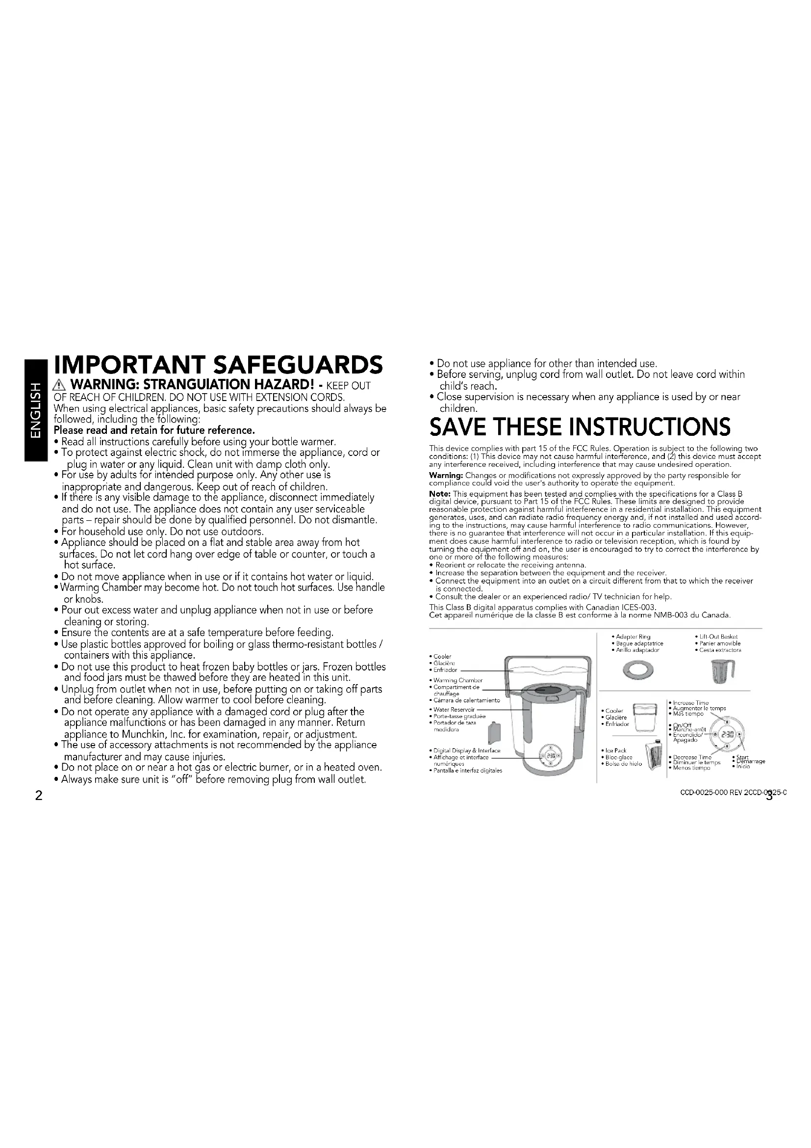 Réchauffer les biberons ou les aliments pour bébé : Remarque : Ces instructions ne sont fournies qu’à titre indicatif. Il existe de nombreuses variables, telles que la taille du biberon, la température ambiante et la température de départ des aliments, qui peuvent avoir un impact sur la vitesse ainsi que sur la température finale auxquelles cet appareil chauffe le biberon ou le petit pot. Modifier au besoin les durées recommandées ci-dessous.Toujours tester la température des aliments avant de nourrir bébé.CCD-0025-000 REV 2CCD-0025-000 REV 210 11