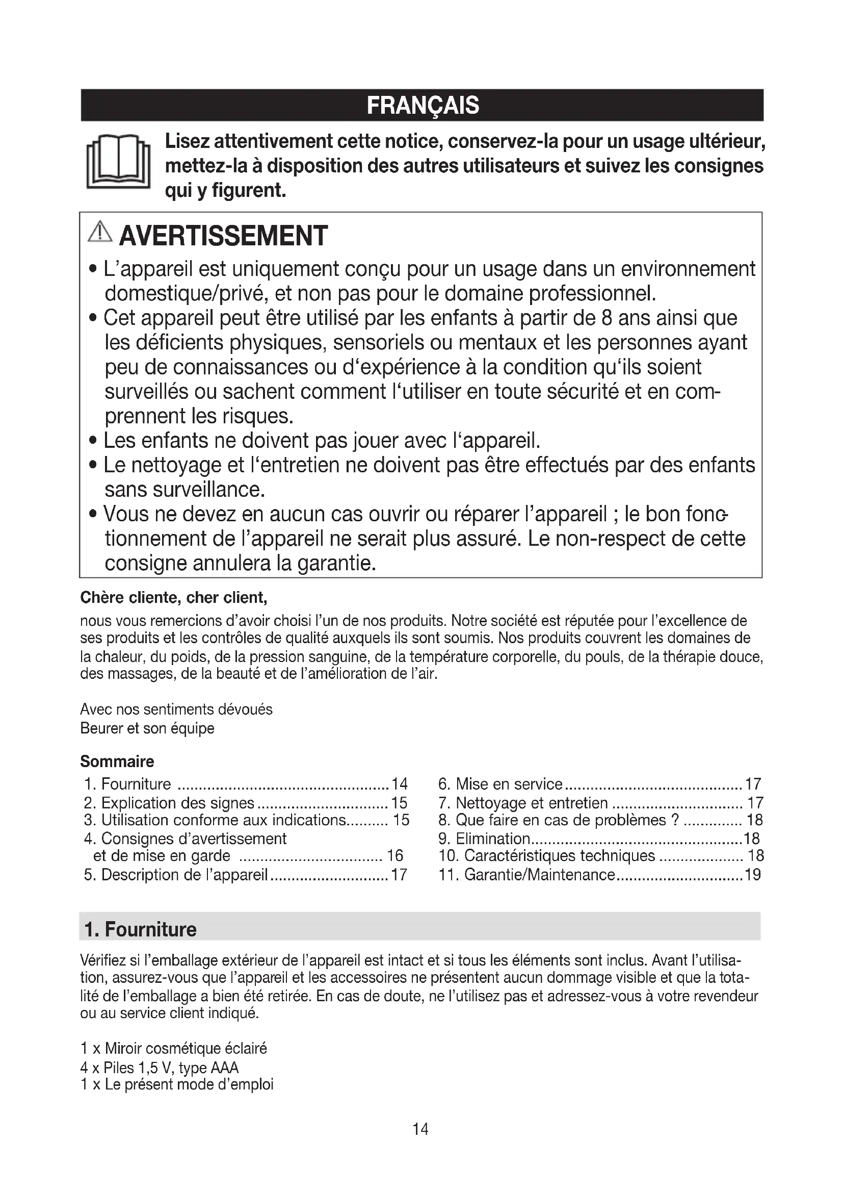 Vérifiez si l’emballage extérieur de l’appareil est intact et si tous les éléments sont inclus. Avant l’utilisa- tion, assurez-vous que l’appareil et les accessoires ne présentent aucun dommage visible et que la tota- lité de l’emballage a bien été retirée. En cas de doute, ne l’utilisez pas et adressez-vous à votre revendeur ou au service client indiqué. 1 x Miroir cosmétique éclairé 4 x Piles 1,5 V, type AAA 1 x Le présent mode d’emploi Sommaire