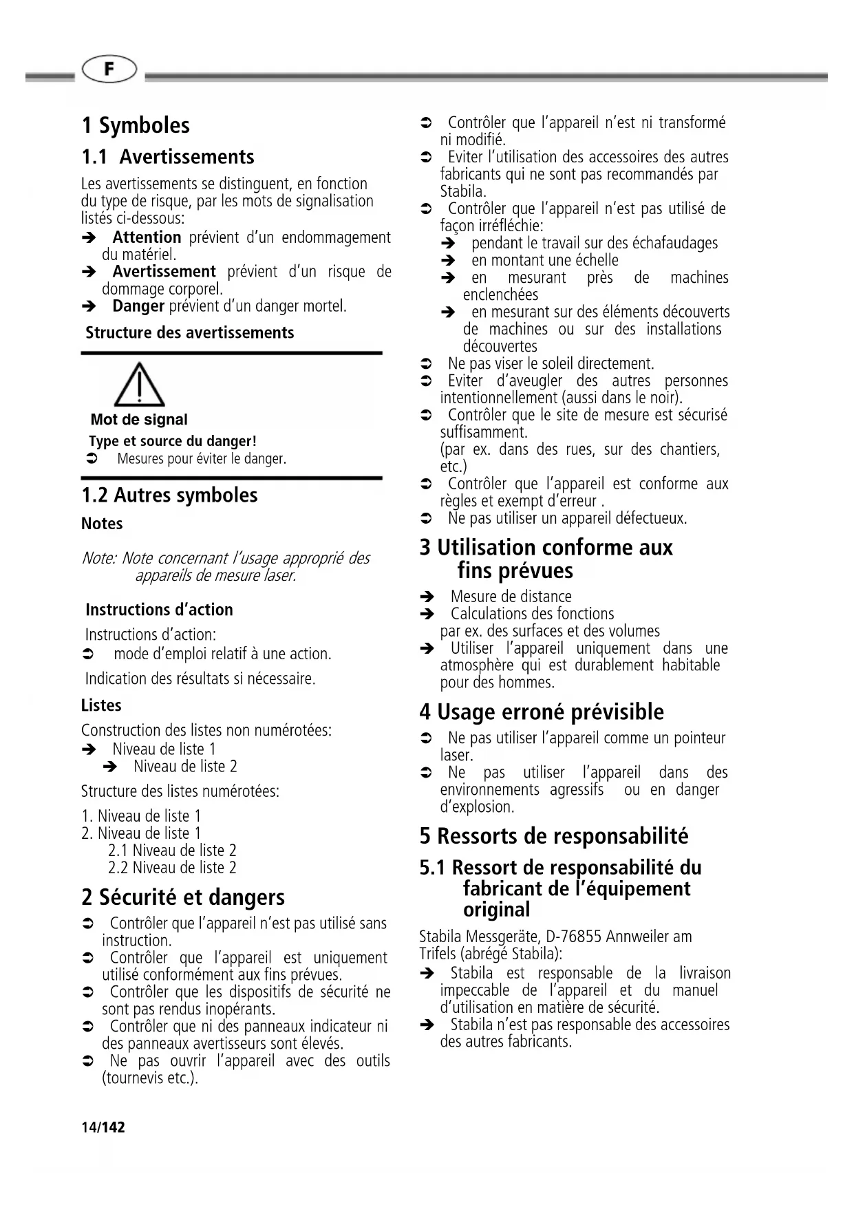 2 Sécurité et dangers  Contrôler que l’appareil n’est pas utilisé sans instruction.  Contrôler que l’appareil est uniquement utilisé conformément aux fins prévues.  Contrôler que les dispositifs de sécurité ne sont pas rendus inopérants.  Contrôler que ni des panneaux indicateur ni des panneaux avertisseurs sont élevés.  Ne pas ouvrir l’appareil avec des outils (tournevis etc.).  Contrôler que l’appareil n’est ni transformé ni modifié.  Eviter l’utilisation des accessoires des autres fabricants qui ne sont pas recommandés par Stabila.  Contrôler que l’appareil n’est pas utilisé de façon irréfléchie: Î pendant le travail sur des échafaudages Î en montant une échelle Î en mesurant près de machines enclenchées Î en mesurant sur des éléments découverts de machines ou sur des installations découvertes  Ne pas viser le soleil directement.  Eviter d‘aveugler des autres personnes intentionnellement (aussi dans le noir).  Contrôler que le site de mesure est sécurisé suffisamment. (par ex. dans des rues, sur des chantiers, etc.)  Contrôler que l’appareil est conforme aux règles et exempt d’erreur .  Ne pas utiliser un appareil défectueux. 3 Utilisation conforme aux fins prévues Î Mesure de distance Î Calculations des fonctions par ex. des surfaces et des volumes Î Utiliser l’appareil uniquement dans une atmosphère qui est durablement habitable pour des hommes. 4 Usage erroné prévisible  Ne pas utiliser l’appareil comme un pointeur laser.  Ne pas utiliser l’appareil dans des environnements agressifs ou en danger d’explosion. 5 Ressorts de responsabilité
