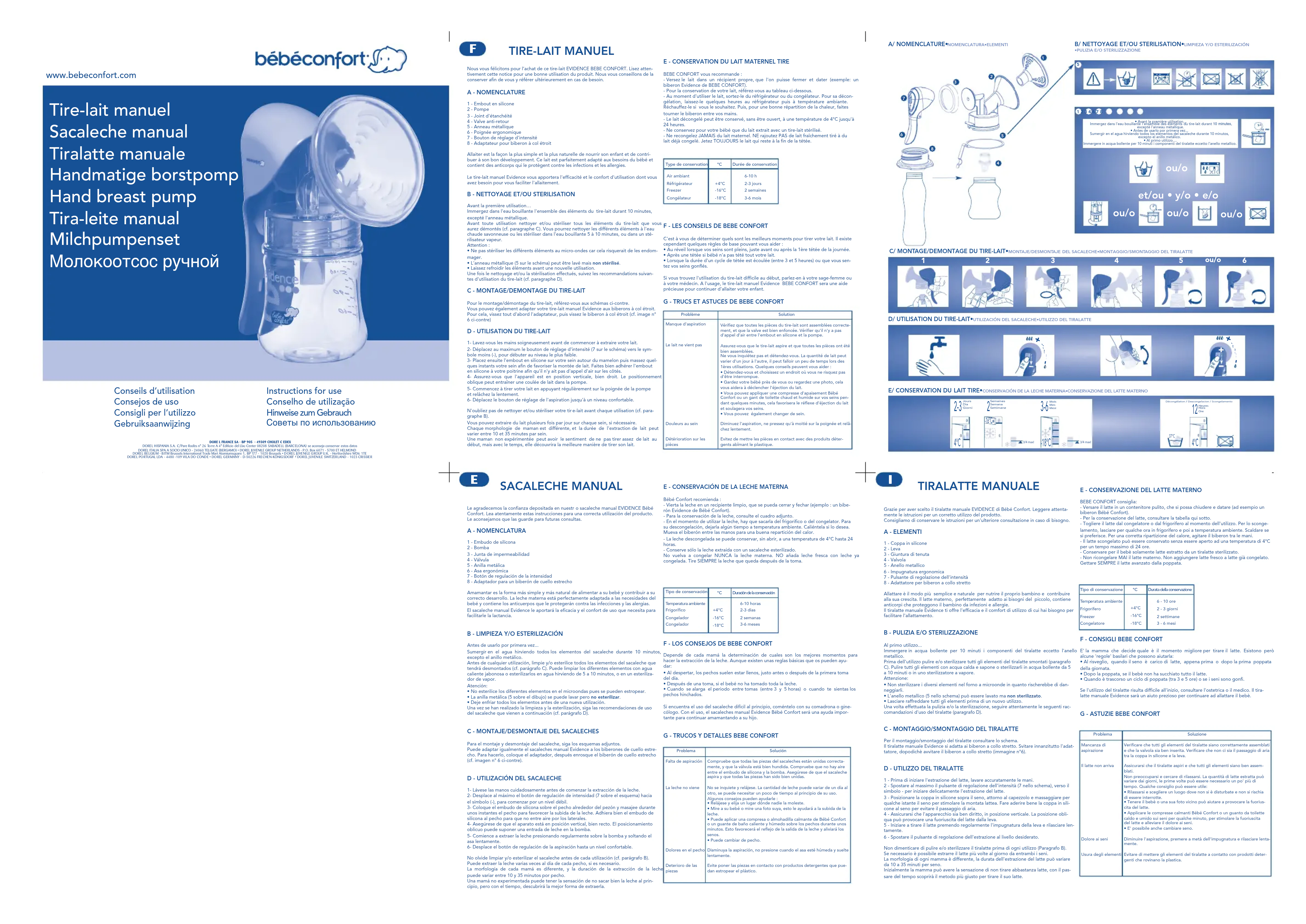 TIRE-LAIT MANUEL Nous vous félicitons pour l’achat de ce tire-lait EVIDENCE BEBE CONFORT. Lisez atten-tivement cette notice pour une bonne utilisation du produit. Nous vous conseillons de laconserver afin de vous y référer ultérieurement en cas de besoin.A - NOMENCLATURE1 - Embout en silicone2 - Pompe3 - Joint d'étanchéité 4 - Valve anti-retour5 - Anneau métallique6 - Poignée ergonomique7 - Bouton de réglage d'intensité8 - Adaptateur pour biberon à col étroitAllaiter est la façon la plus simple et la plus naturelle de nourrir son enfant et de contri-buer à son bon développement. Ce lait est parfaitement adapté aux besoins du bébé etcontient des anticorps qui le protègent contre les infections et les allergies.Le tire-lait manuel Evidence vous apportera l'efficacité et le confort d'utilisation dont vousavez besoin pour vous faciliter l'allaitement.B - NETTOYAGE ET/OU STERILISATIONAvant la première utilisation…Immergez dans l'eau bouillante l'ensemble des éléments du tire-lait durant 10 minutes,excepté l'anneau métallique.Avant toute utilisation nettoyer et/ou stériliser tous les éléments du tire-lait que vousaurez démontés (cf. paragraphe C). Vous pourrez nettoyer les différents éléments à l'eauchaude savonneuse ou les stériliser dans l'eau bouillante 5 à 10 minutes, ou dans un sté-rilisateur vapeur. Attention :• Ne pas stériliser les différents éléments au micro-ondes car cela risquerait de les endom-mager.• L'anneau métallique (5 sur le schéma) peut être lavé mais non stérilisé.• Laissez refroidir les éléments avant une nouvelle utilisation.Une fois le nettoyage et/ou la stérilisation effectués, suivez les recommandations suivan-tes d'utilisation du tire-lait (cf. paragraphe D).C - MONTAGE/DEMONTAGE DU TIRE-LAITPour le montage/démontage du tire-lait, référez-vous aux schémas ci-contre.Vous pouvez également adapter votre tire-lait manuel Evidence aux biberons à col étroit.Pour cela, vissez tout d'abord l'adaptateur, puis vissez le biberon à col étroit (cf. image n°6 ci-contre)D - UTILISATION DU TIRE-LAIT1- Lavez-vous les mains soigneusement avant de commencer à extraire votre lait.2- Déplacez au maximum le bouton de réglage d'intensité (7 sur le schéma) vers le sym-bole moins (-), pour débuter au niveau le plus faible.3- Placez ensuite l'embout en silicone sur votre sein autour du mamelon puis massez quel-ques instants votre sein afin de favoriser la montée de lait. Faites bien adhérer l'embouten silicone à votre poitrine afin qu'il n'y ait pas d'appel d'air sur les côtés.4- Assurez-vous que l'appareil est en position verticale, bien droit. Le positionnementoblique peut entraîner une coulée de lait dans la pompe.5- Commencez à tirer votre lait en appuyant régulièrement sur la poignée de la pompeet relâchez la lentement.6- Déplacez le bouton de réglage de l'aspiration jusqu'à un niveau confortable.N'oubliez pas de nettoyer et/ou stériliser votre tire-lait avant chaque utilisation (cf. para-graphe B).Vous pouvez extraire du lait plusieurs fois par jour sur chaque sein, si nécessaire.Chaque morphologie de maman est différente, et la durée de l'extraction de lait peutvarier entre 10 et 35 minutes par sein.Une maman non expérimentée peut avoir le sentiment de ne pas tirer assez de lait audébut, mais avec le temps, elle découvrira la meilleure manière de tirer son lait.E - CONSERVATION DU LAIT MATERNEL TIREBEBE CONFORT vous recommande :- Versez le lait dans un récipient propre, que l'on puisse fermer et dater (exemple: unbiberon Evidence de BEBE CONFORT).- Pour la conservation de votre lait, référez-vous au tableau ci-dessous.- Au moment d'utiliser le lait, sortez-le du réfrigérateur ou du congélateur. Pour sa décon-gélation, laissez-le quelques heures au réfrigérateur puis à température ambiante.Réchauffez-le si vous le souhaitez. Puis, pour une bonne répartition de la chaleur, faitestourner le biberon entre vos mains.- Le lait décongelé peut être conservé, sans être ouvert, à une température de 4°C jusqu'à24 heures.- Ne conservez pour votre bébé que du lait extrait avec un tire-lait stérilisé.- Ne recongelez JAMAIS du lait maternel. NE rajoutez PAS de lait fraîchement tiré à dulait déjà congelé. Jetez TOUJOURS le lait qui reste à la fin de la tétée.F - LES CONSEILS DE BEBE CONFORTC'est à vous de déterminer quels sont les meilleurs moments pour tirer votre lait. Il existecependant quelques règles de base pouvant vous aider : • Au réveil lorsque vos seins sont pleins, juste avant ou après la 1ère tétée de la journée.• Après une tétée si bébé n'a pas tété tout votre lait.• Lorsque la durée d'un cycle de tétée est écoulée (entre 3 et 5 heures) ou que vous sen-tez vos seins gonflés.Si vous trouvez l'utilisation du tire-lait difficile au début, parlez-en à votre sage-femme ouà votre médecin. A l'usage, le tire-lait manuel Evidence BEBE CONFORT sera une aideprécieuse pour continuer d'allaiter votre enfant.G - TRUCS ET ASTUCES DE BEBE CONFORTA/ NOMENCLATURE•NOMENCLATURA•ELEMENTIType de conservationAir ambiantRéfrigérateurFreezerCongélateur +4°C -16°C-18°CDurée de conservation6-10 h2-3 jours2 semaines3-6 moisProblèmeManque d'aspirationLe lait ne vient pasDouleurs au seinDétérioration sur les pièces www.bebeconfort.comDORE L FRANCE SA - BP 905 - 49309 CHOLET C EDEX DOREL HISPANIA S.A. C/Pare Rodès n° 26 Torre A 4° Edificio del Llac Center 08208 SABADELL (BARCELONA) se aconseja conservar estos datos DOREL ITALIA SPA A SOCIO UNICO - 24060 TELGATE (BERGAMO) • DOREL JUVENILE GROUP NETHERLANDS - P.O. Box 6071 - 5700 ET HELMOND DOREL BELGIUM - BITM Brussels International Trade Mart Atomiumsquare 1, BP 177 - 1020 Brussels • DOREL JUVENILE GROUP U.K. - Hertfordshire WD6 1TE DOREL PORTUGAL LDA - 4480 -109 VILA DO CONDE • DOREL GERMANY - D-50226 FRECHEN-KÖNIGSDORF • DOREL JUVENILE SWITZERLAND - 1023 CRISSIER Conseils