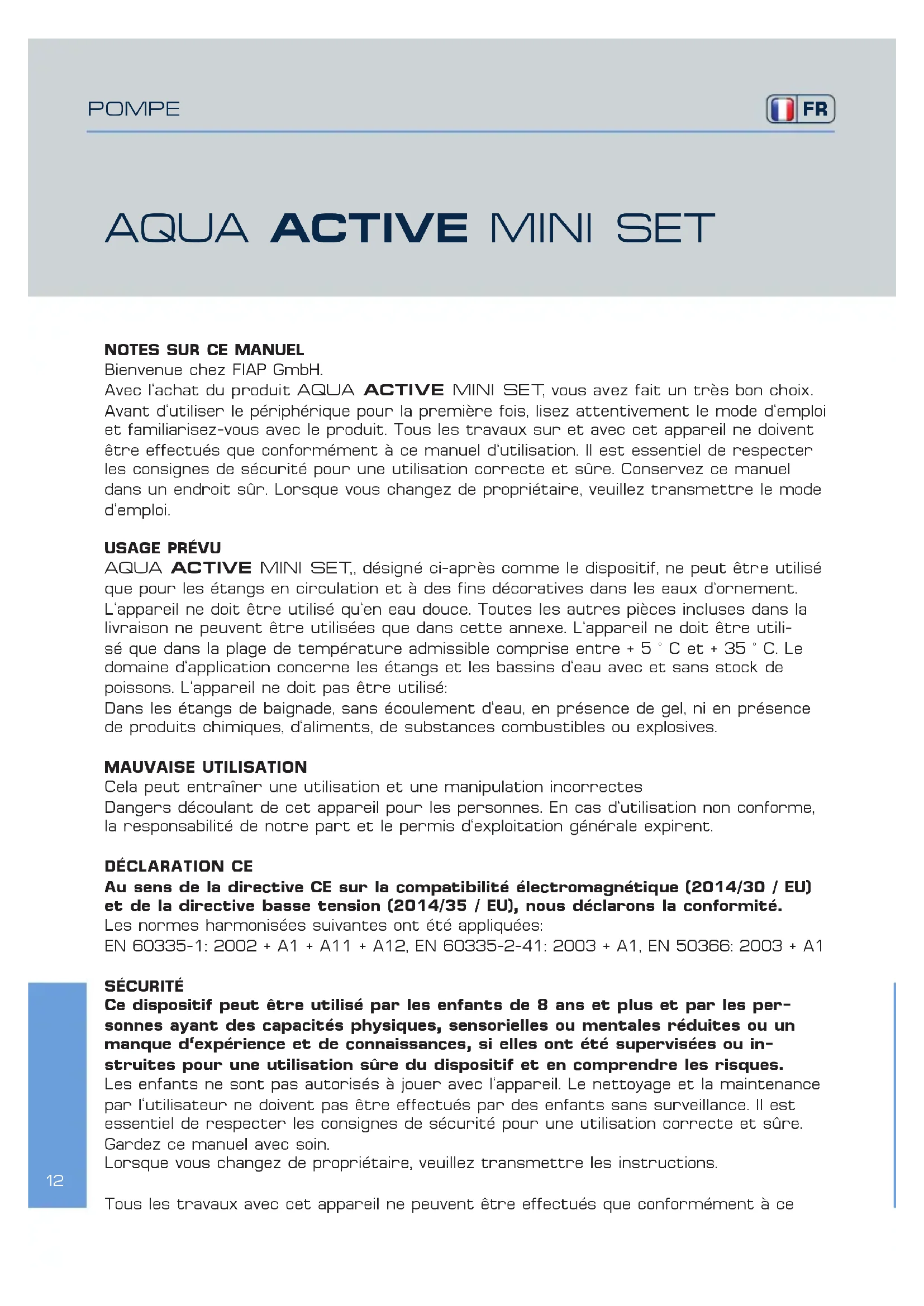 Retrouvez gratuitement la notice de l'appareil Aqua Active Mini set 1000 Fiap au format PDF.