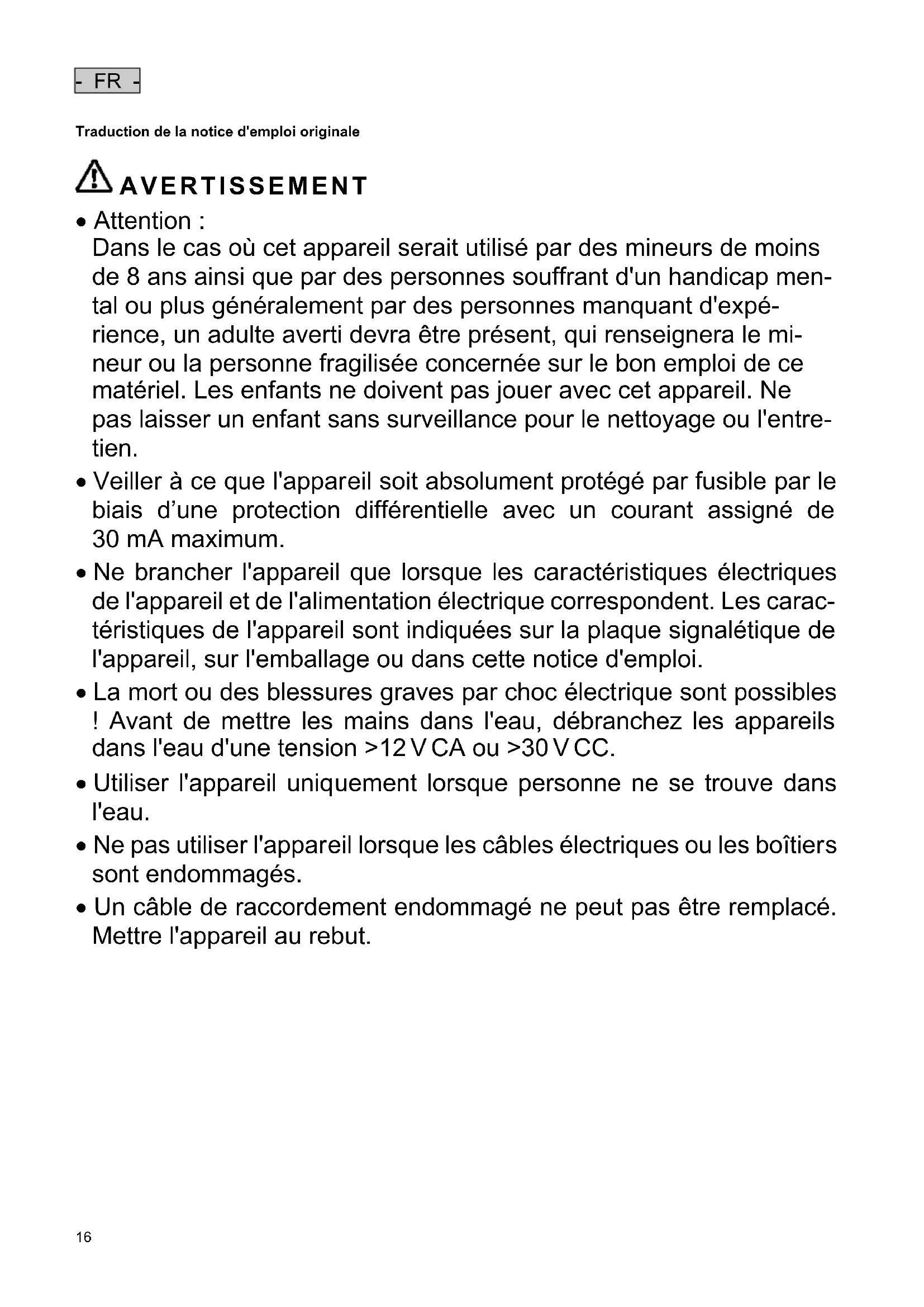 - La mort ou des blessures graves par choc électrique sont possibles ! Avant de mettre les mains dans l'eau, débranchez les appareils dans l'eau d'une tension >12 V CA ou >30 V CC.