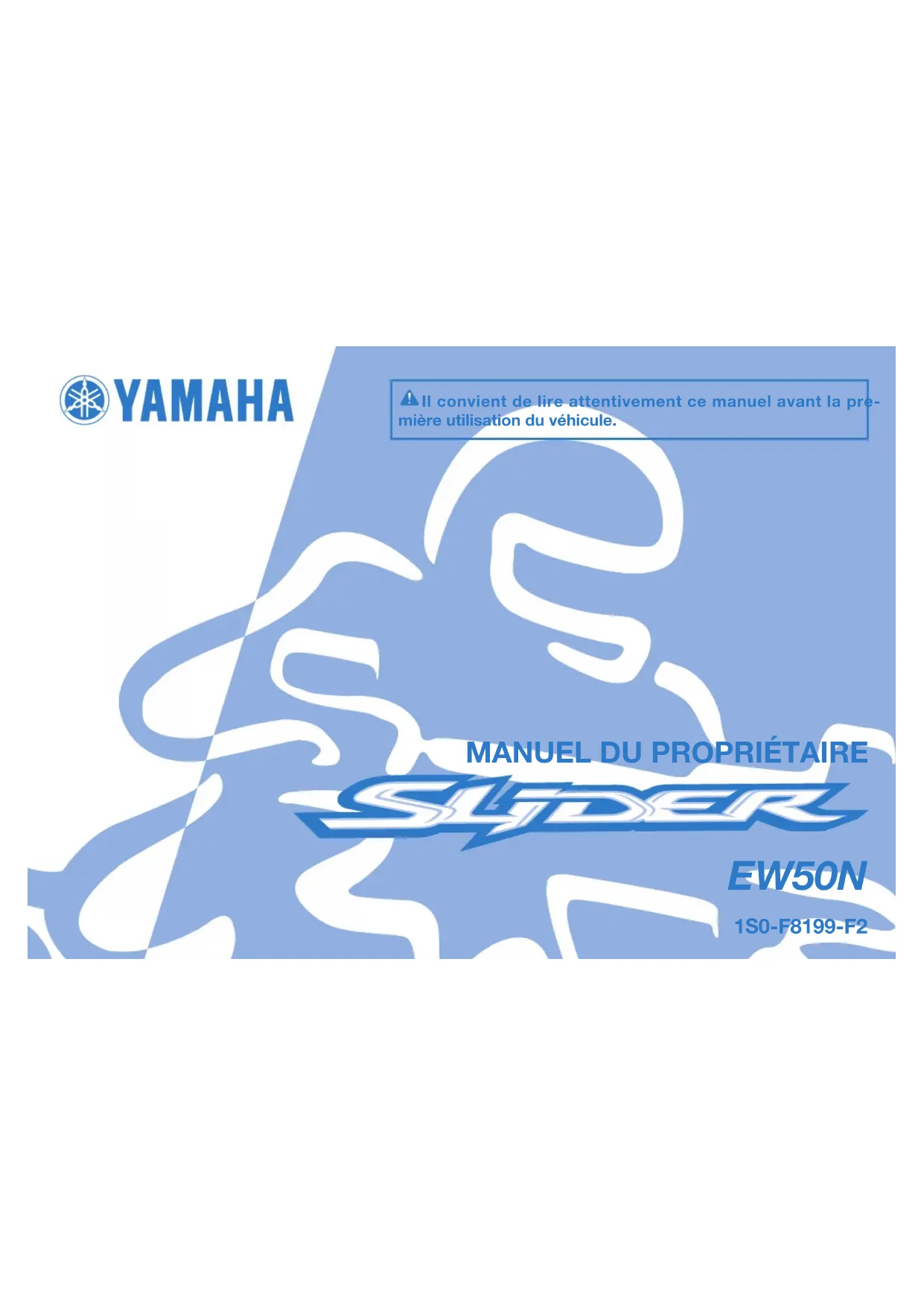 Il convient de lire attentivement ce manuel avant la pre- mière utilisation du véhicule. 1S0-F8199-F2 [French (F)]FAU46091 Il convient de lire attentivement ce manuel avant la première utilisation du véhicule. Le manuel doit être remis avec le véhi- cule en cas de vente de ce dernier. U1S0F2F0.book Page 1 Thursday, July 25, 2013 7:16 PMINTRODUCTION FAU10114 Bienvenue dans l’univers des deux roues de Yamaha ! Le modèle EW50N est le fruit de la grande expérience de Yamaha dans l’application des technologies de pointe à la conception et à la fabrication de produits de qualité supérieure, et qui a valu à Yamaha sa réputation dans ce domaine. Afin de tirer le meilleur parti de toutes les possibilités de la EW50N, lire attentivement ce manuel. Le Manuel du propriétaire contient non seulement les instructions relatives à l’utilisation, aux contrôles et à l’entretien de ce scooter, mais aussi d’importantes consignes de sé- curité destinées à protéger le pilote et les tiers des accidents. Ce manuel offre en outre de nombreux conseils qui, s’ils sont bien suivis, permettront de conserver le scooter en parfait état de marche. Si la moindre question se pose, il ne faut pas hésiter à consulter un concessionnaire Yamaha. L’équipe Yamaha espère que ce véhicule procurera à son utilisateur un plaisir de conduite et une sécurité maximum kilomètre après ki- lomètre. Ne pas oublier toutefois que la sécurité doit rester la première priorité de tout bon motocycliste ! Yamaha est sans cesse à la recherche d’améliorations dans la conception et la qualité de ses produits. Par conséquent, bien que ce manuel contienne les informations les plus récentes disponibles au moment de l’impression, il peut ne pas refléter de petites modifica- tions apportées ultérieurement à ce scooter. Au moindre doute concernant le fonctionnement ou l’entretien du véhicule, ne pas hésiter à consulter un concessionnaire Yamaha. AVERTISSEMENT FWA12412 Lire attentivement ce manuel dans son intégralité avant d’utiliser ce scooter. U1S0F2F0.book Page 1 Thursday, July 25, 2013 7:16 PMINFORMATIONS IMPORTANTES CONCERNANT LE MANUEL FAU10134 Les informations particulièrement importantes sont repérées par les notations suivantes :