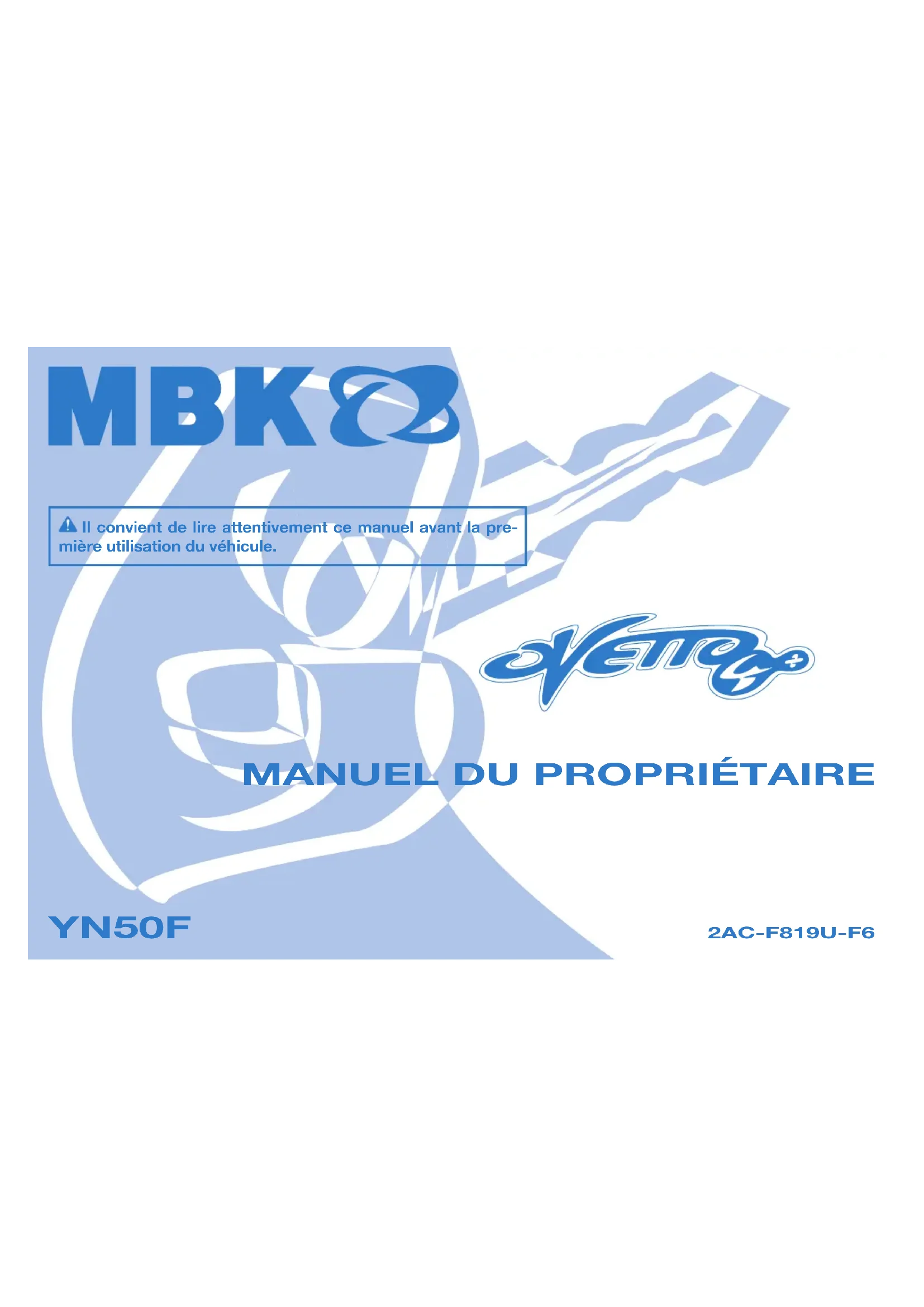 PANTONE285C Il convient de lire attentivement ce manuel avant la pre- mière utilisation du véhicule.FAU46091 Il convient de lire attentivement ce manuel avant la première utilisation du véhicule. Le manuel doit être remis avec le véhi- cule en cas de vente de ce dernier. U2ACF6F0.book Page 1 Monday, July 8, 2013 6:49 PMINTRODUCTION FAU10114 Bienvenue dans l’univers des deux roues de MBK ! Le modèle YN50F est le fruit de la grande expérience de MBK dans l’application des technologies de pointe à la conception et à la fa- brication de produits de qualité supérieure, et qui a valu à MBK sa réputation dans ce domaine. Afin de tirer le meilleur parti de toutes les possibilités de la YN50F, lire attentivement ce manuel. Le Manuel du propriétaire contient non seulement les instructions relatives à l’utilisation, aux contrôles et à l’entretien de ce scooter, mais aussi d’importantes consignes de sé- curité destinées à protéger le pilote et les tiers des accidents. Ce manuel offre en outre de nombreux conseils qui, s’ils sont bien suivis, permettront de conserver le scooter en parfait état de marche. Si la moindre question se pose, il ne faut pas hésiter à consulter un concessionnaire MBK. L’équipe MBK espère que ce véhicule procurera à son utilisateur un plaisir de conduite et une sécurité maximum kilomètre après kilo- mètre. Ne pas oublier toutefois que la sécurité doit rester la première priorité de tout bon motocycliste ! MBK est sans cesse à la recherche d’améliorations dans la conception et la qualité de ses produits. Par conséquent, bien que ce manuel contienne les informations les plus récentes disponibles au moment de l’impression, il peut ne pas refléter de petites modifications ap- portées ultérieurement à ce scooter. Au moindre doute concernant le fonctionnement ou l’entretien du véhicule, ne pas hésiter à consulter un concessionnaire MBK. AVERTISSEMENT FWA12412 Lire attentivement ce manuel dans son intégralité avant d’utiliser ce scooter. U2ACF6F0.book Page 1 Monday, July 8, 2013 6:49 PMINFORMATIONS IMPORTANTES CONCERNANT LE MANUEL FAU10134 Les informations particulièrement importantes sont repérées par les notations suivantes :
