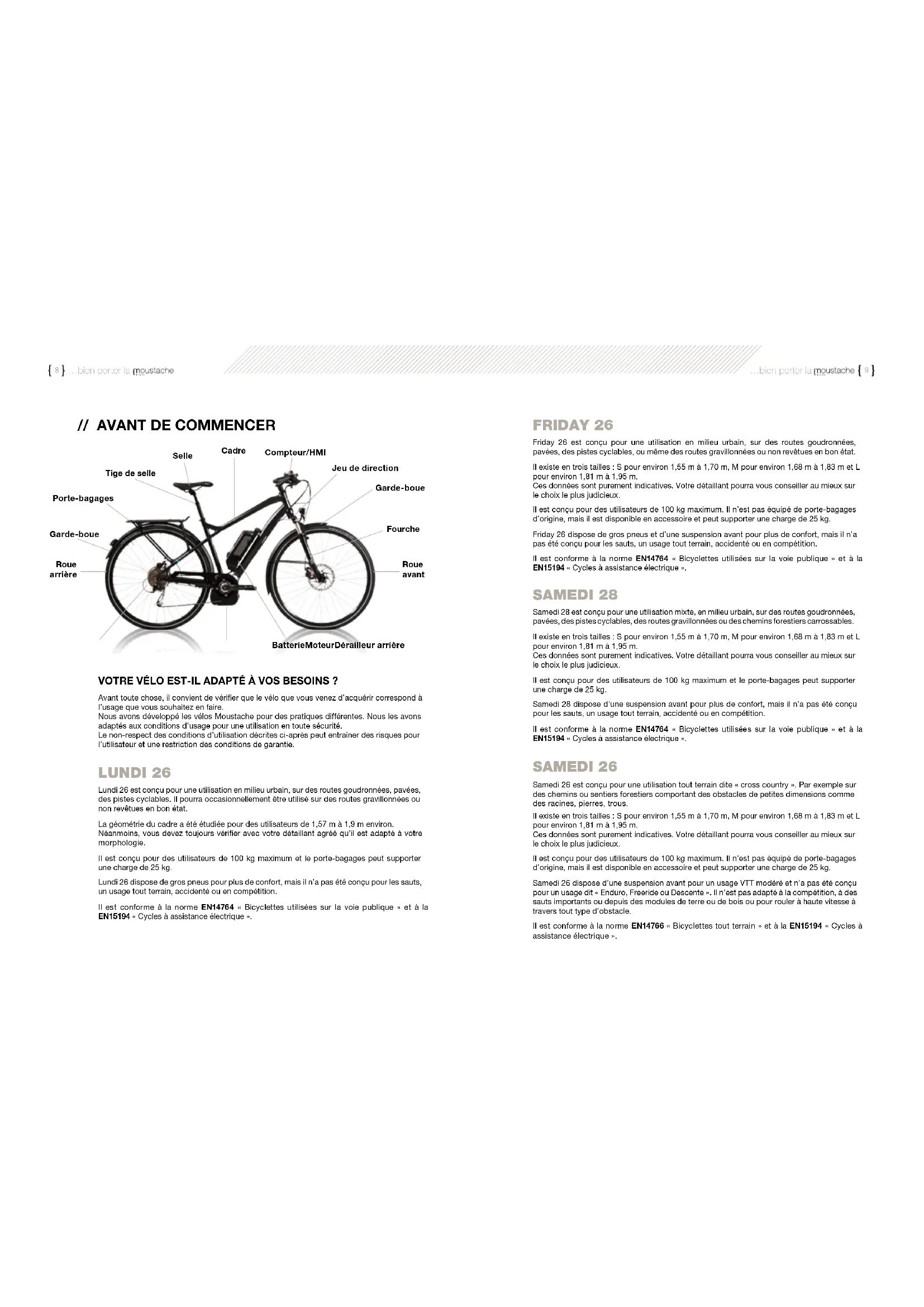 Nous avons développé les vélos Moustache pour des pratiques différentes. Nous les avons adaptés aux conditions d'utilisation pour une utilisation en toute sécurité.