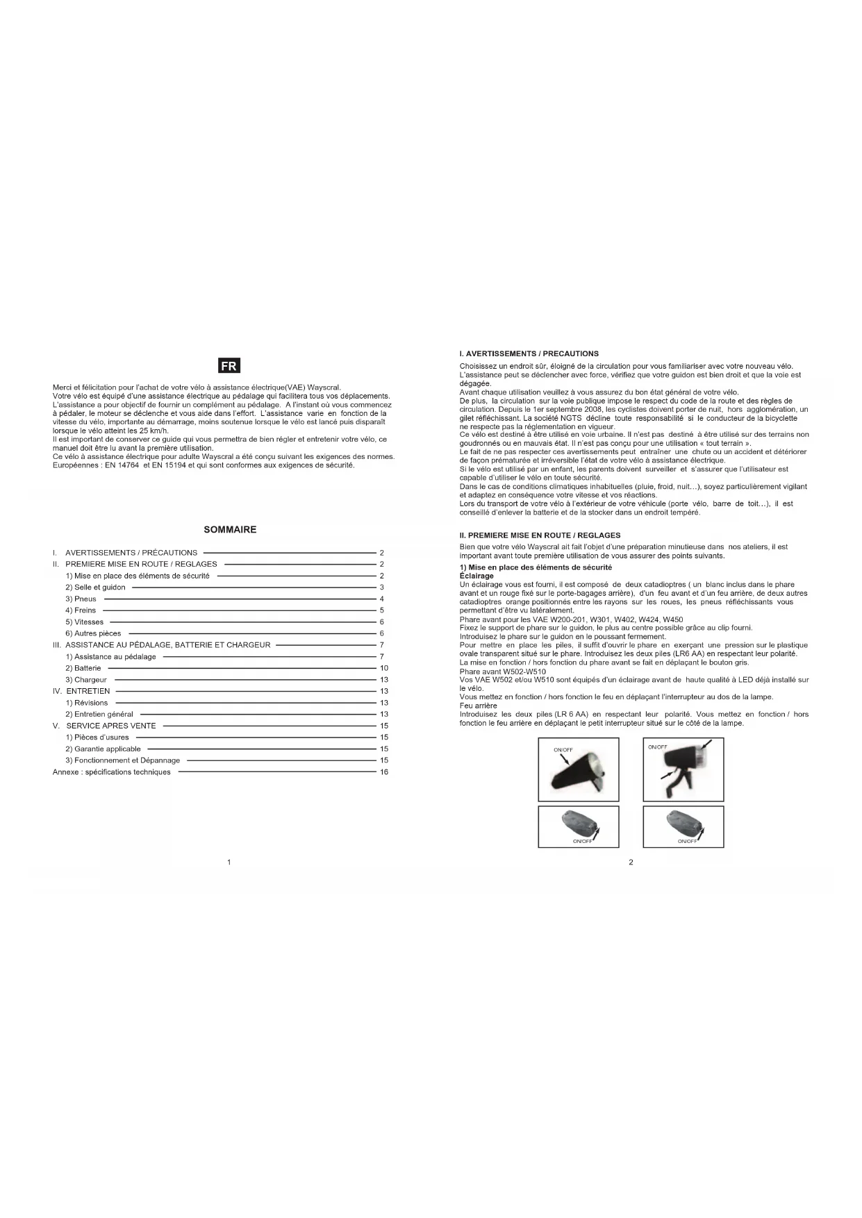 SOMMAIRE Merci et félicitation pour l’achat de votre vélo à assistance électrique(VAE) Wayscral. Votre vélo est équipé d’une assistance électrique au pédalage qui facilitera tous vos déplacements. L’assistance a pour objectif de fournir un complément au pédalage. A l’instant où vous commencez à pédaler, le moteur se déclenche et vous aide dans l’effort. L’assistance varie en fonction de la vitesse du vélo, importante au démarrage, moins soutenue lorsque le vélo est lancé puis disparaît lorsque le vélo atteint les 25 km/h. Il est important de conserver ce guide qui vous permettra de bien régler et entretenir votre vélo, ce manuel doit être lu avant la première utilisation. Ce vélo à assistance électrique pour adulte Wayscral a été conçu suivant les exigences des normes. Européennes : EN 14764 et EN 15194 et qui sont conformes aux exigences de sécurité.