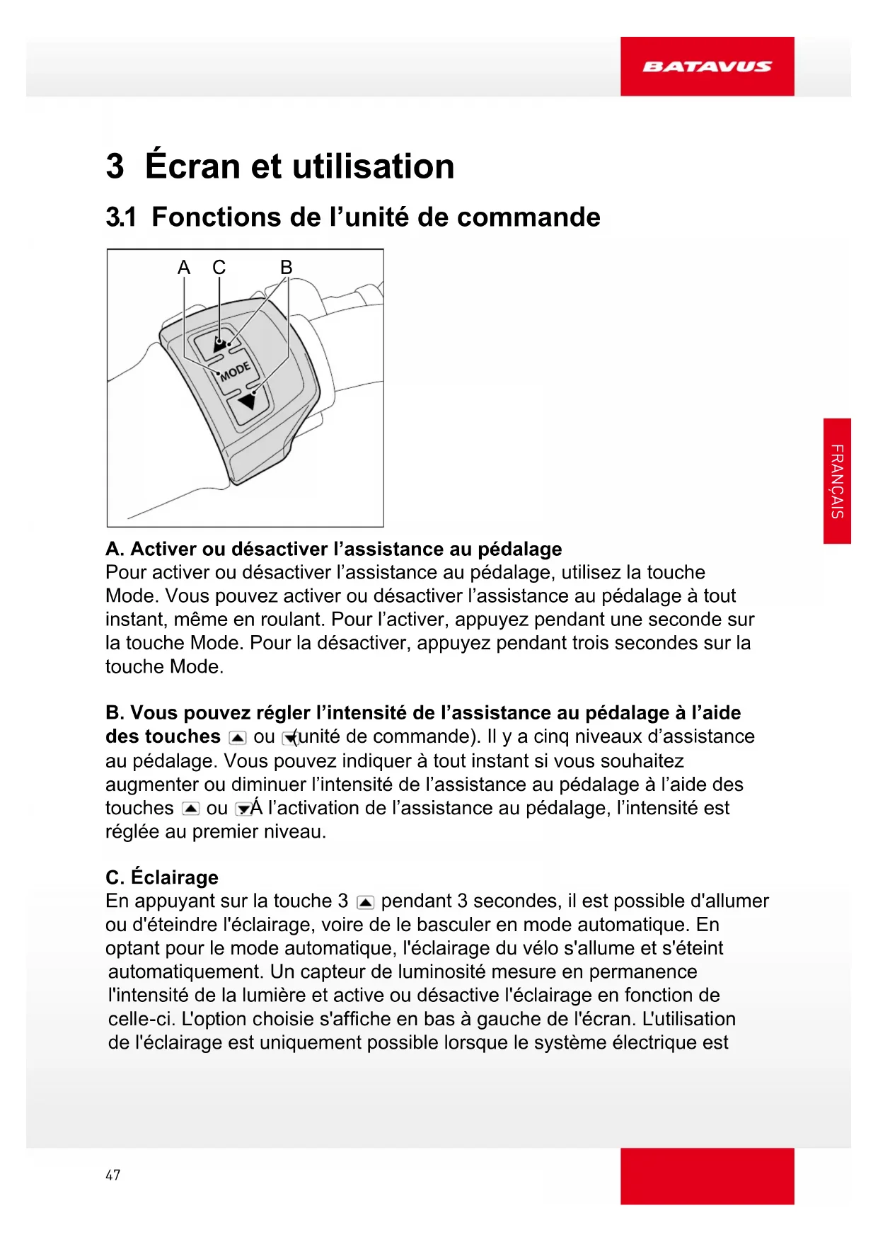 acté. Si vous poulez seulement utiliser l'éclairage, sans utiliser l'assistance électrique, vous pouze désactiver cette dernière à l'aide du bouton