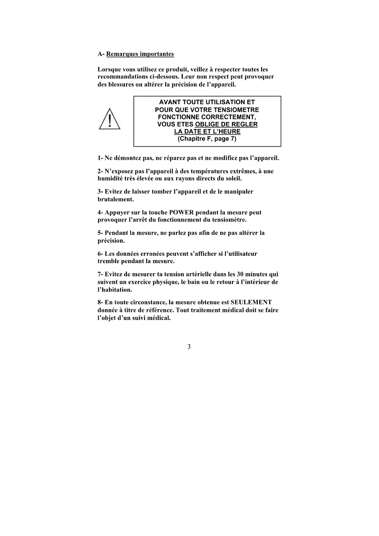 - Lisez attentivement ce mode d’emploi avant d’utiliser votre tensiomètre2 Index A- Remarques importantes p. 3