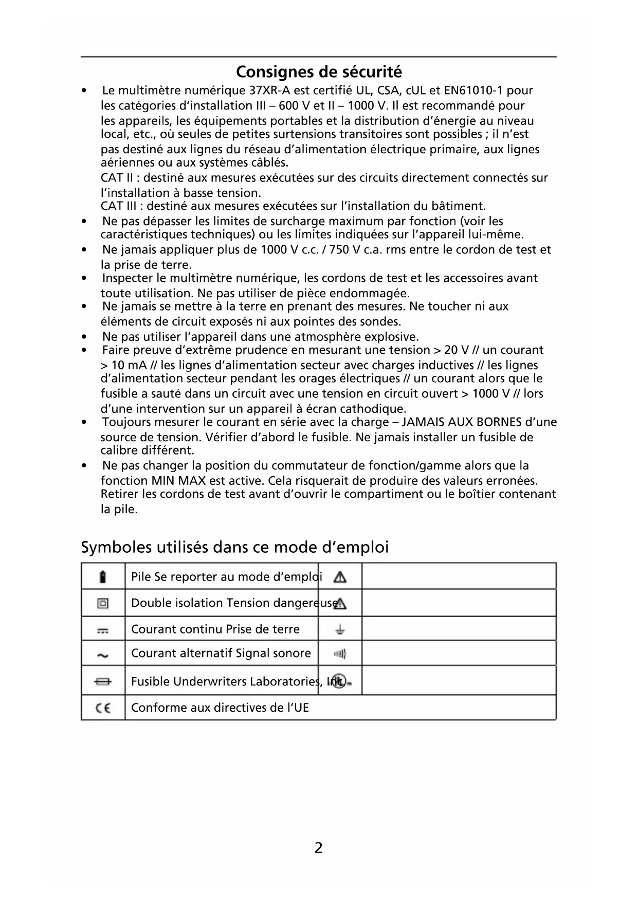 - Ne pas changer la position du commutateur de fonction/gamme alors que la fonction MIN MAX est active. Cela risquerait de produire des valeurs erronées. Retirer les cordons de test avant d’ouvrir le compartiment ou le boîtier contenant la pile. Symboles utilisés dans ce mode d’emploi Pile Se reporter au mode d’emploi Double isolation Tension dangereuse Courant continu Prise de terre Courant alternatif Signal sonore Fusible Underwriters Laboratories, Inc. Conforme aux directives de l’UE3 Introduction Le 37XR-A est un multimètre numérique portable à gamme automatique permettant de mesurer ou de tester les grandeurs efficaces vraies suivantes :