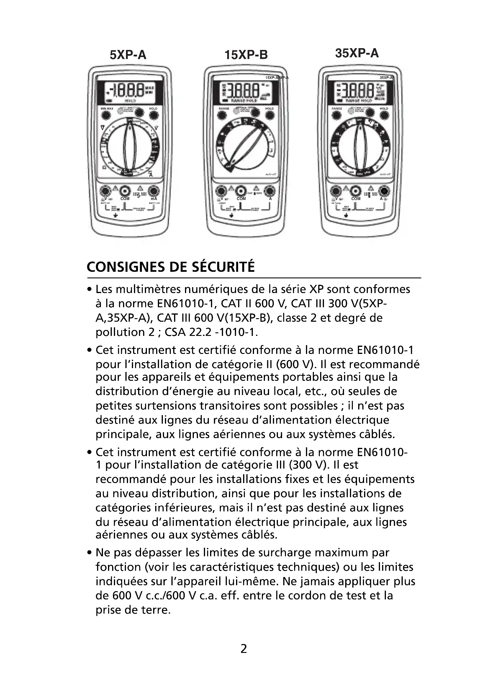 - Les multimètres numériques de la série XP sont conformes à la norme EN61010-1, CAT II 600 V, CAT III 300 V(5XP- A,35XP-A), CAT III 600 V(15XP-B), classe 2 et degré de pollution 2 ; CSA 22.2 -1010-1.
