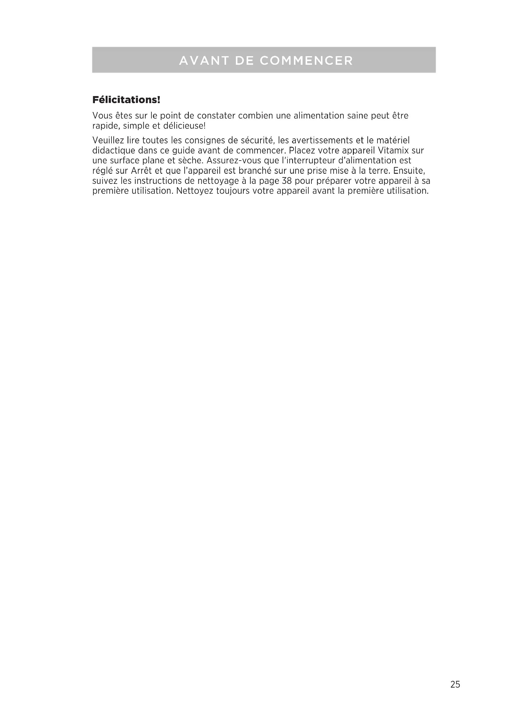 - Caractéristiques Techniques CONTENU25 Félicitations! Vous êtes sur le point de constater combien une alimentation saine peut être rapide, simple et délicieuse! Veuillez lire toutes les consignes de sécurité, les avertissements et le matériel didactique dans ce guide avant de commencer. Placez votre appareil Vitamix sur une surface plane et sèche. Assurez-vous que l’interrupteur d’alimentation est réglé sur Arrêt et que l’appareil est branché sur une prise mise à la terre. Ensuite, suivez les instructions de nettoyage à la page38 pour préparer votre appareil à sa première utilisation. Nettoyez toujours votre appareil avant la première utilisation. p. 42