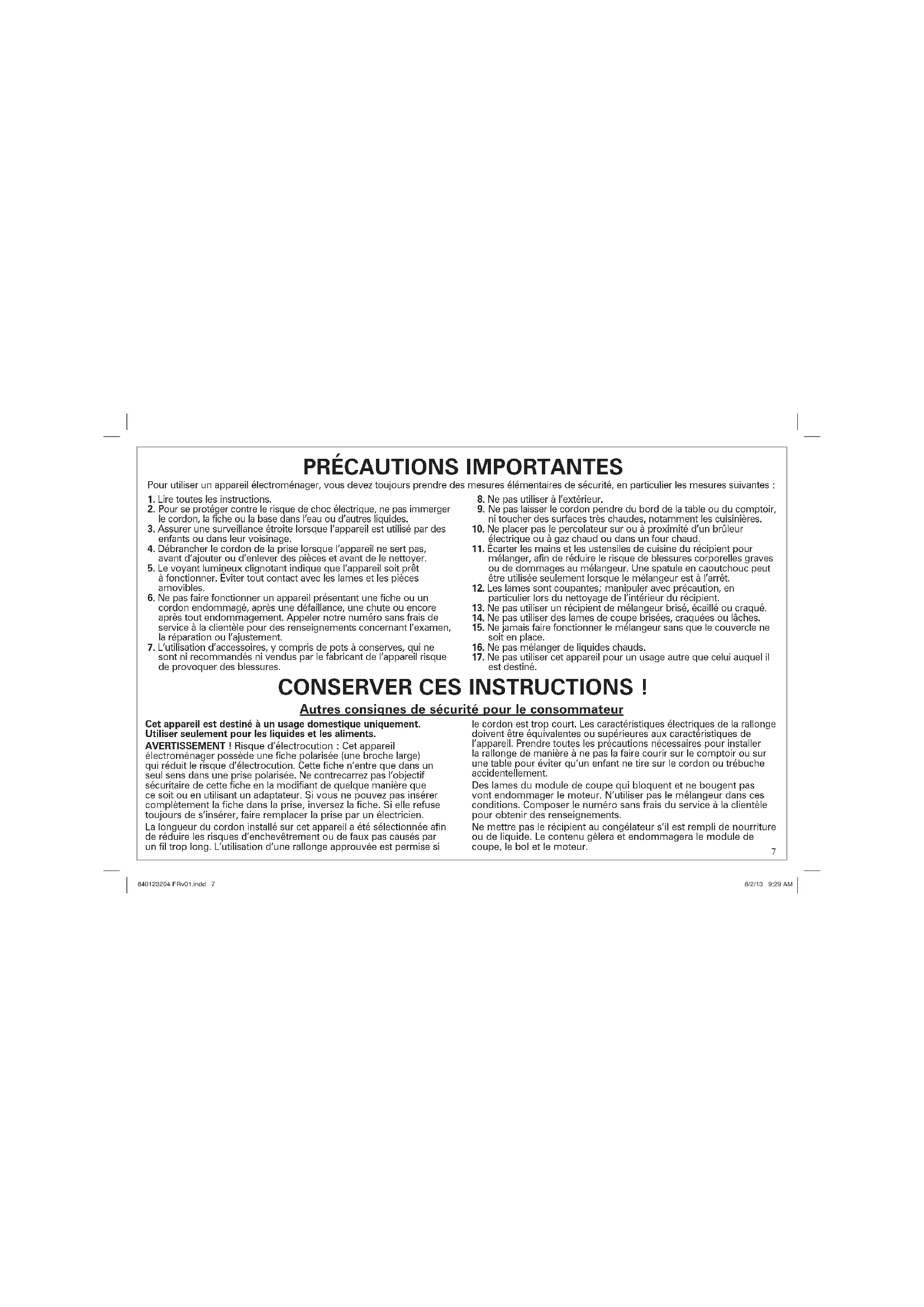 est destiné. Pour utiliser un appareil électroménager, vous devez toujours prendre des mesures élémentaires de sécurité, en particulier les mesures suivantes : Cet appareil est destiné à un usage domestique uniquement. Utiliser seulement pour les liquides et les aliments. AVERTISSEMENT ! Risque d’électrocution : Cet appareil électroménager possède une fiche polarisée (une broche large) qui réduit le risque d’électrocution. Cette fiche n’entre que dans un seul sens dans une prise polarisée. Ne contrecarrez pas l’objectif sécuritaire de cette fiche en la modifiant de quelque manière que ce soit ou en utilisant un adaptateur. Si vous ne pouvez pas insérer complètement la fiche dans la prise, inversez la fiche. Si elle refuse toujours de s’insérer, faire remplacer la prise par un électricien. La longueur du cordon installé sur cet appareil a été sélectionnée afin de réduire les risques d’enchevêtrement ou de faux pas causés par un fil trop long. L’utilisation d’une rallonge approuvée est permise si le cordon est trop court. Les caractéristiques électriques de la rallonge doivent être équivalentes ou supérieures aux caractéristiques de l’appareil. Prendre toutes les précautions nécessaires pour installer la rallonge de manière à ne pas la faire courir sur le comptoir ou sur une table pour éviter qu’un enfant ne tire sur le cordon ou trébuche accidentellement. Des lames du module de coupe qui bloquent et ne bougent pas vont endommager le moteur. N’utiliser pas le mélangeur dans ces conditions. Composer le numéro sans frais du service à la clientèle pour obtenir des renseignements. Ne mettre pas le récipient au congélateur s’il est rempli de nourriture ou de liquide. Le contenu gèlera et endommagera le module de coupe, le bol et le moteur. CONSERVER CES INSTRUCTIONS ! Autres consignes de sécurité pour le consommateur