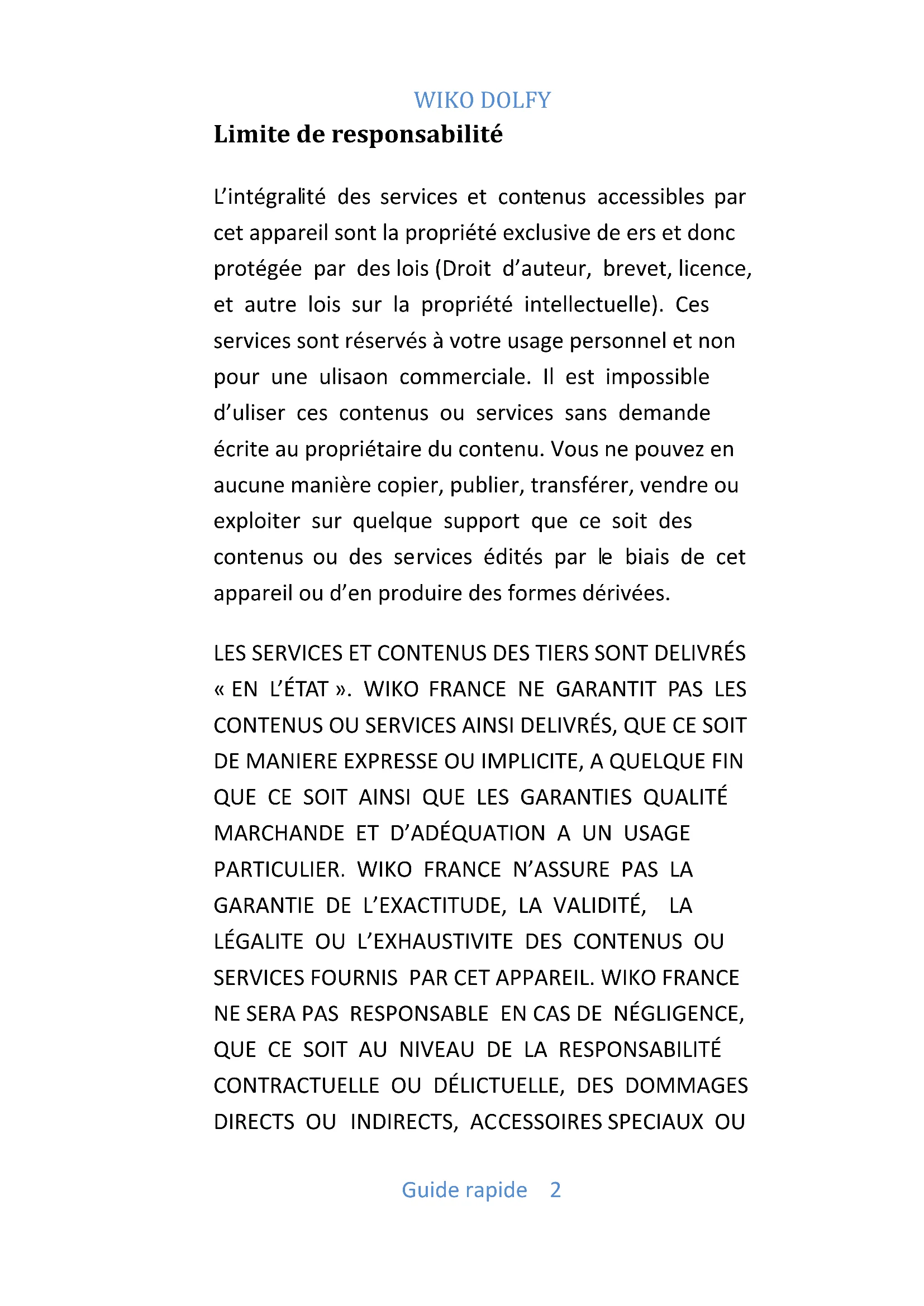 WIKO DOLFY Guide rapide 2 Limite de responsabilité L’intégralité des services et contenus accessibles par cet appareil sont la propriété exclusive de tiers et donc protégée par des lois (Droit d’auteur, brevet, licence, et autre lois sur la propriété intellectuelle). Ces services sont réservés à votre usage personnel et non pour une utilisation commerciale. Il est impossible d’utiliser ces contenus ou services sans demande écrite au propriétaire du contenu. Vous ne pouvez en aucune manière copier, publier, transférer, vendre ou exploiter sur quelque support que ce soit des contenus ou des services édités par le biais de cet appareil ou d’en produire des formes dérivées. LES SERVICES ET CONTENUS DES TIERS SONT DELIVRÉS « EN L’ÉTAT ». WIKO FRANCE NE GARANTIT PAS LES CONTENUS OU SERVICES AINSI DELIVRÉS, QUE CE SOIT DE MANIERE EXPRESSE OU IMPLICITE, A QUELQUE FIN QUE CE SOIT AINSI QUE LES GARANTIES QUALITÉ MARCHANDE ET D’ADÉQUATION A UN USAGE PARTICULIER. WIKO FRANCE N’ASSURE PAS LA GARANTIE DE L’EXACTITUDE, LA VALIDITÉ, LA LÉGALITE OU L’EXHAUSTIVITE DES CONTENUS OU SERVICES FOURNIS PAR CET APPAREIL. WIKO FRANCE NE SERA PAS RESPONSABLE EN CAS DE NÉGLIGENCE, QUE CE SOIT AU NIVEAU DE LA RESPONSABILITÉ