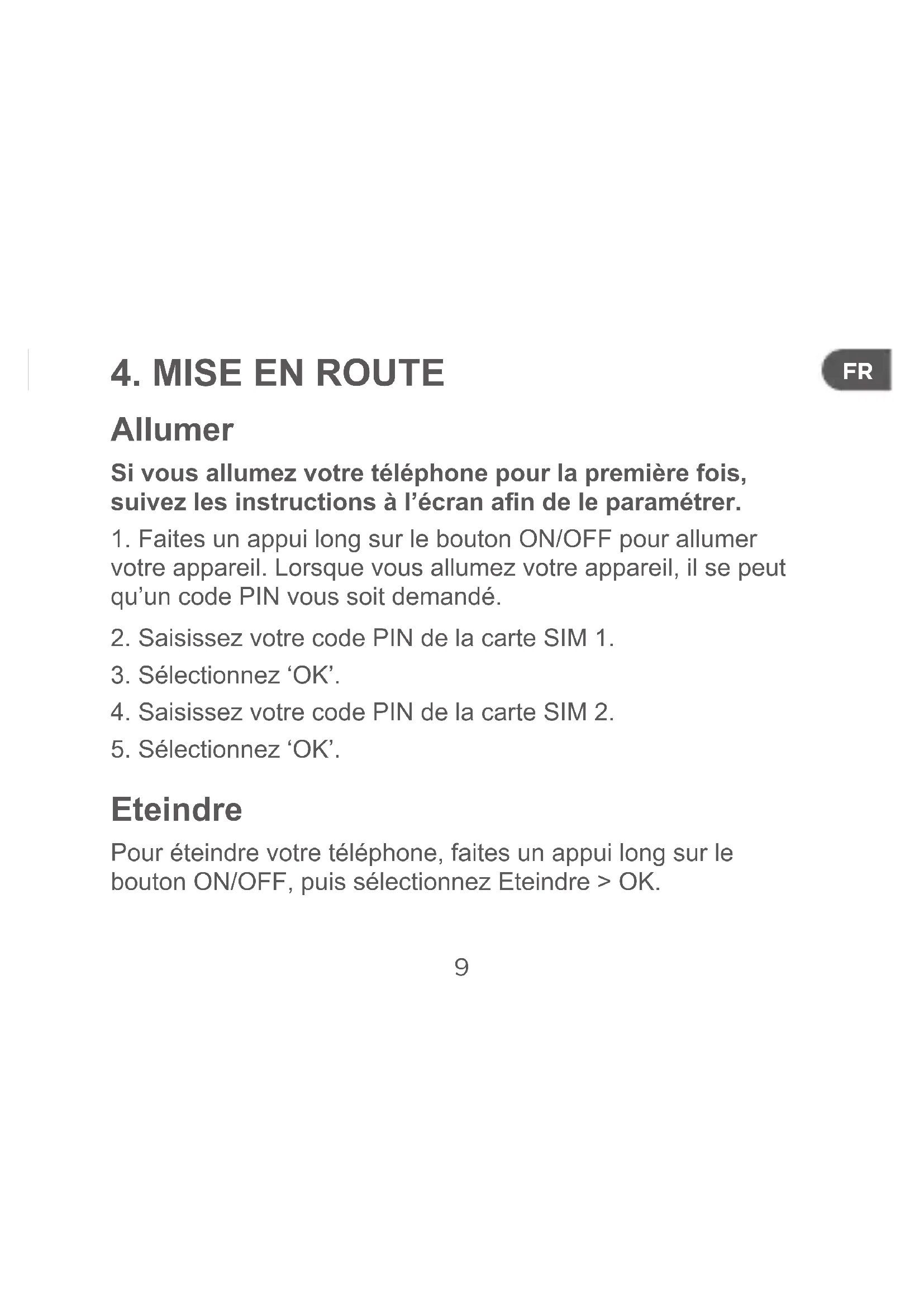 Eteindre Pour éteindre votre téléphone, faites un appui long sur le bouton ON/OFF, puis sélectionnez Eteindre > OK.10