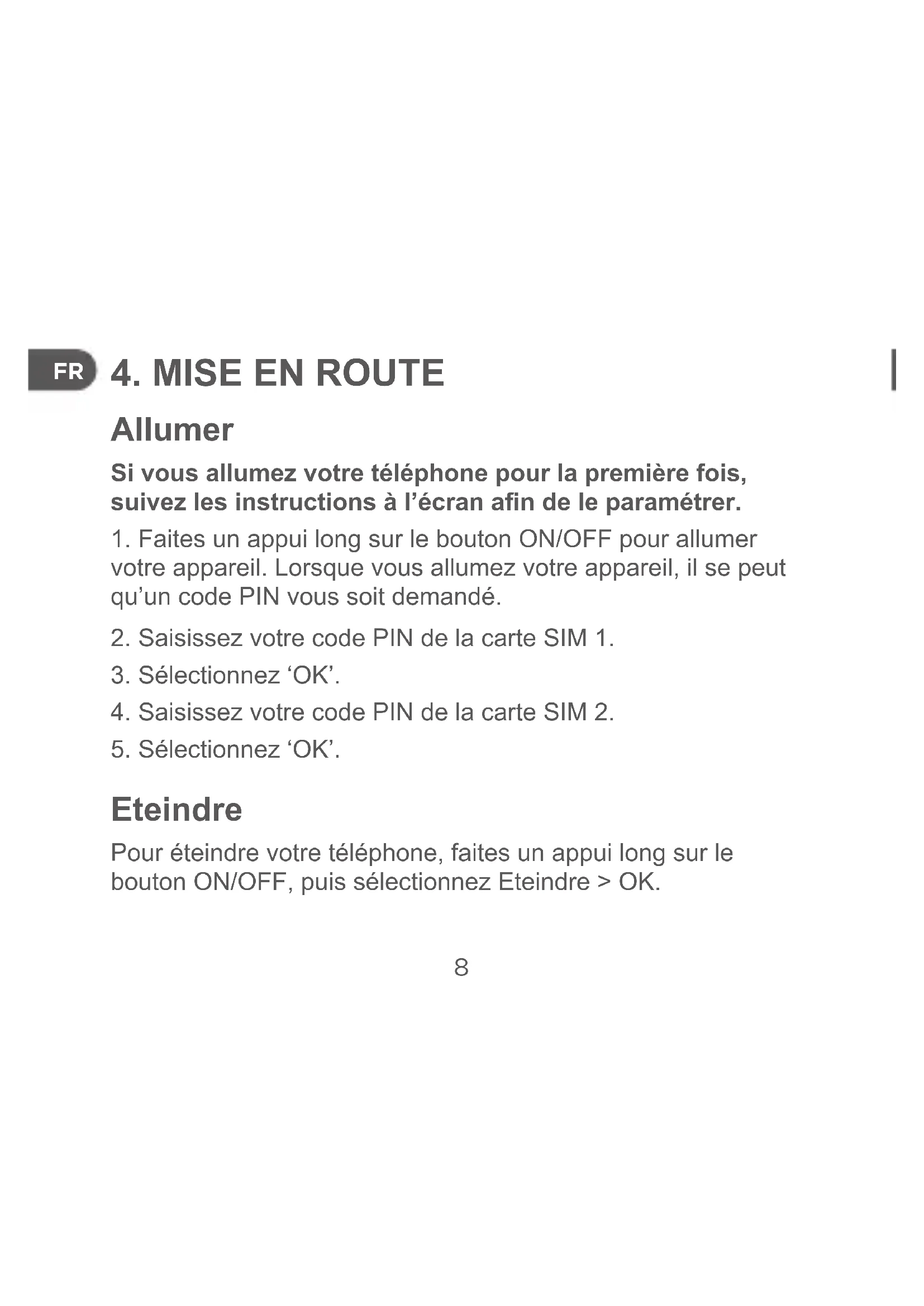 Eteindre Pour éteindre votre téléphone, faites un appui long sur le bouton ON/OFF, puis sélectionnez Eteindre > OK.9