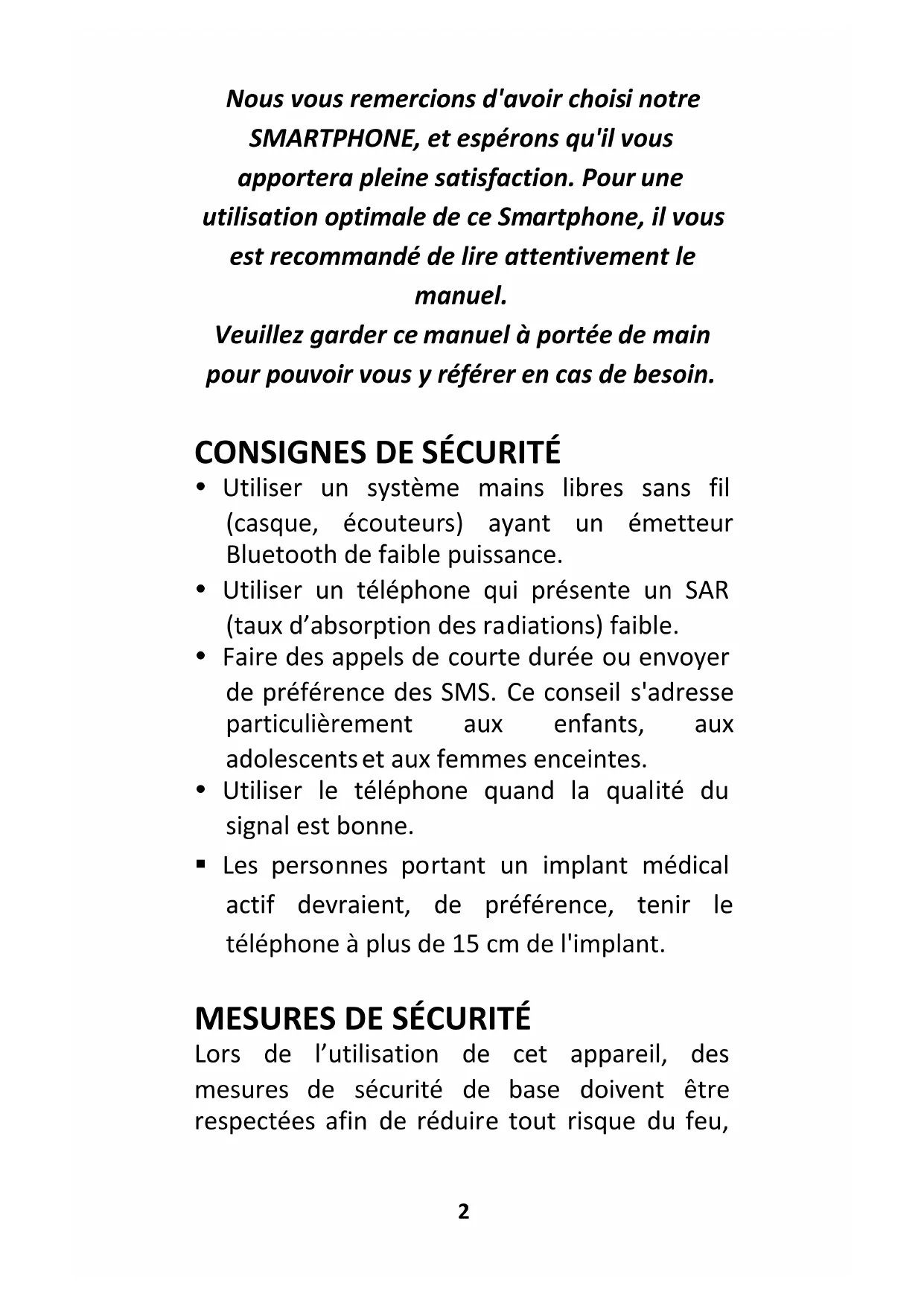 ‐Manueld’utilisation–2 Nousvousremercionsd'avoirchoisinotre SMARTPHONE,etespéronsqu'ilvous apporterapleinesatisfaction.Pourune utilisationoptimaledeceSmartphone,ilvous estrecommandédelireattentivementle manuel. Veuillezgardercemanuelàportéedemain pourpouvoirvousyréférerencasdebesoin.