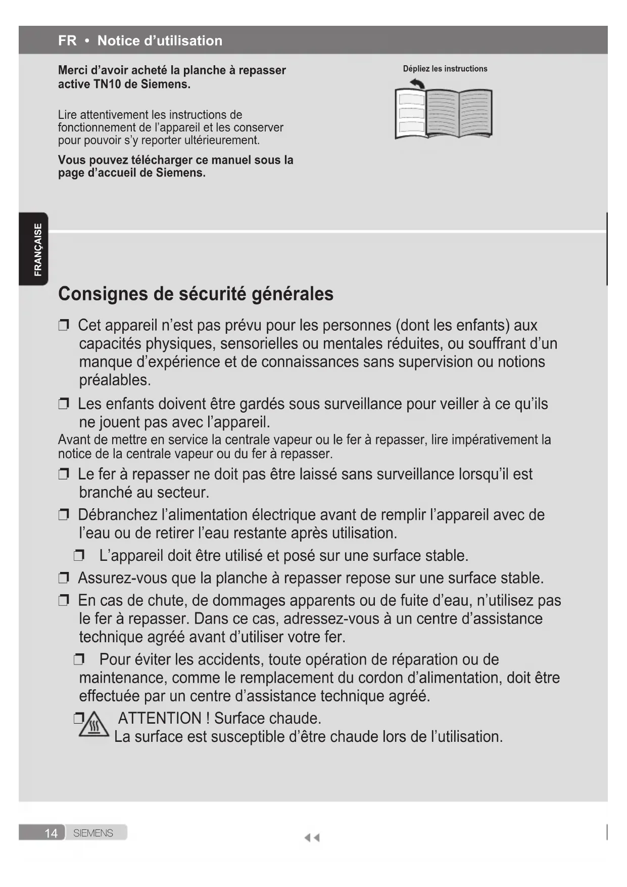 ATTENTION ! Surface chaude. La surface est susceptible d’être chaude lors de l’utilisation. FR • Notice d’utilisation Merci d’avoir acheté la planche à repasser active TN10 de Siemens. Lire attentivement les instructions de fonctionnement de l’appareil et les conserver pour pouvoir s’y reporter ultérieurement. Vous pouvez télécharger ce manuel sous la page d’accueil de Siemens.15 S I E M E N S FraNçaISE Remarques importantes