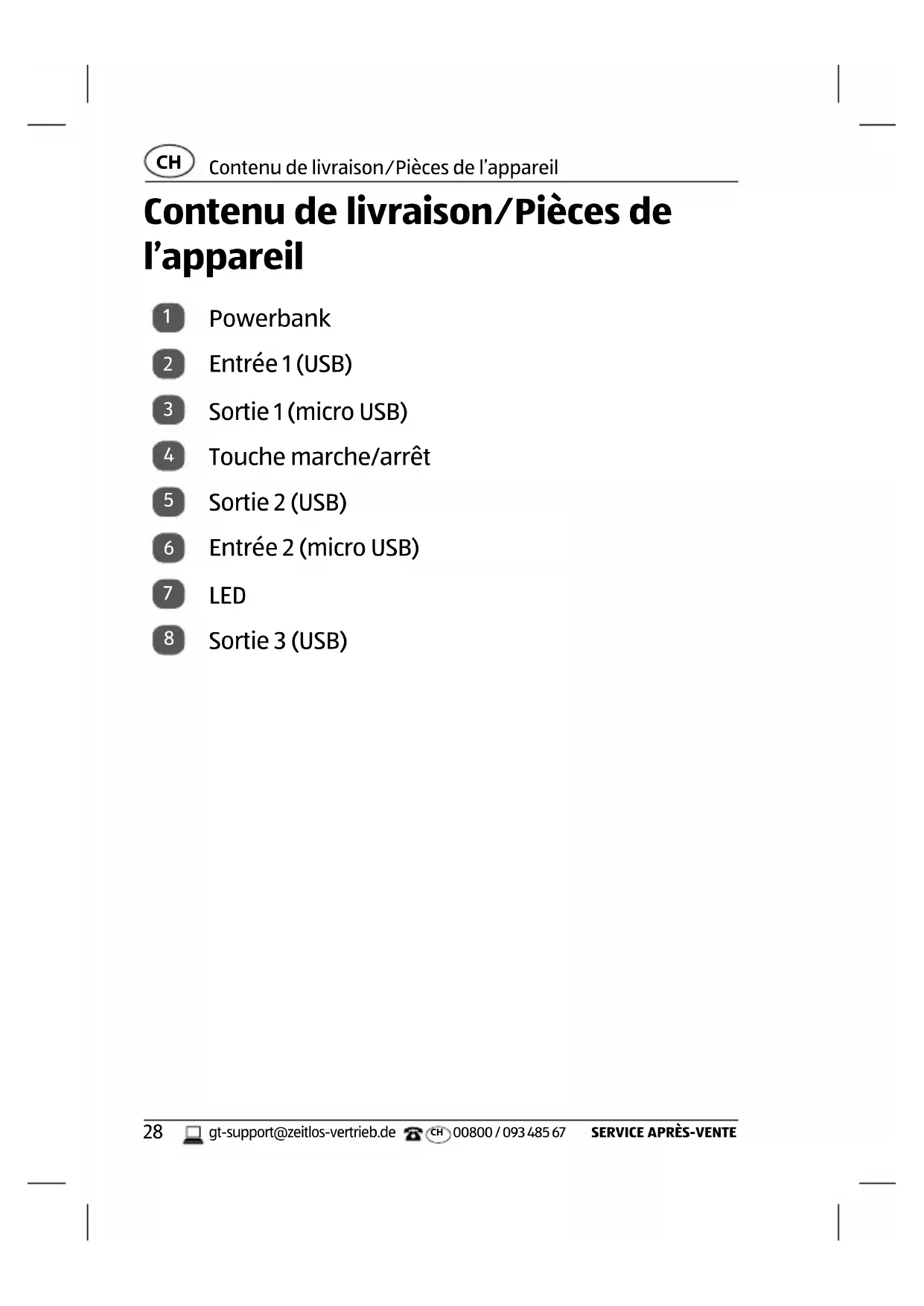 00800 / 093 485 67 AVERTISSEMENT! Risque d’explosion! Les piles peuvent exploser si elles sont forte- ment chauffées. − Ne chauffez pas le Powerbank et ne le jetez jamais dans un feu. − Ne court-circuitez pas le Powerbank. AVIS! Risque d’endommagement! Un maniement inapproprié du Powerbank peut l’endommager. − Ne plongez jamais le Powerbank dans l’eau ou autres liquides. − Maintenez le Powerbank éloigné d’un feu et de surfaces brûlantes. − N’utilisez pas le Powerbank en cas de pluie ou dans un environnement humide. Séchez immédiatement le Powerbank s’il devient néanmoins humide.Première mise en service
