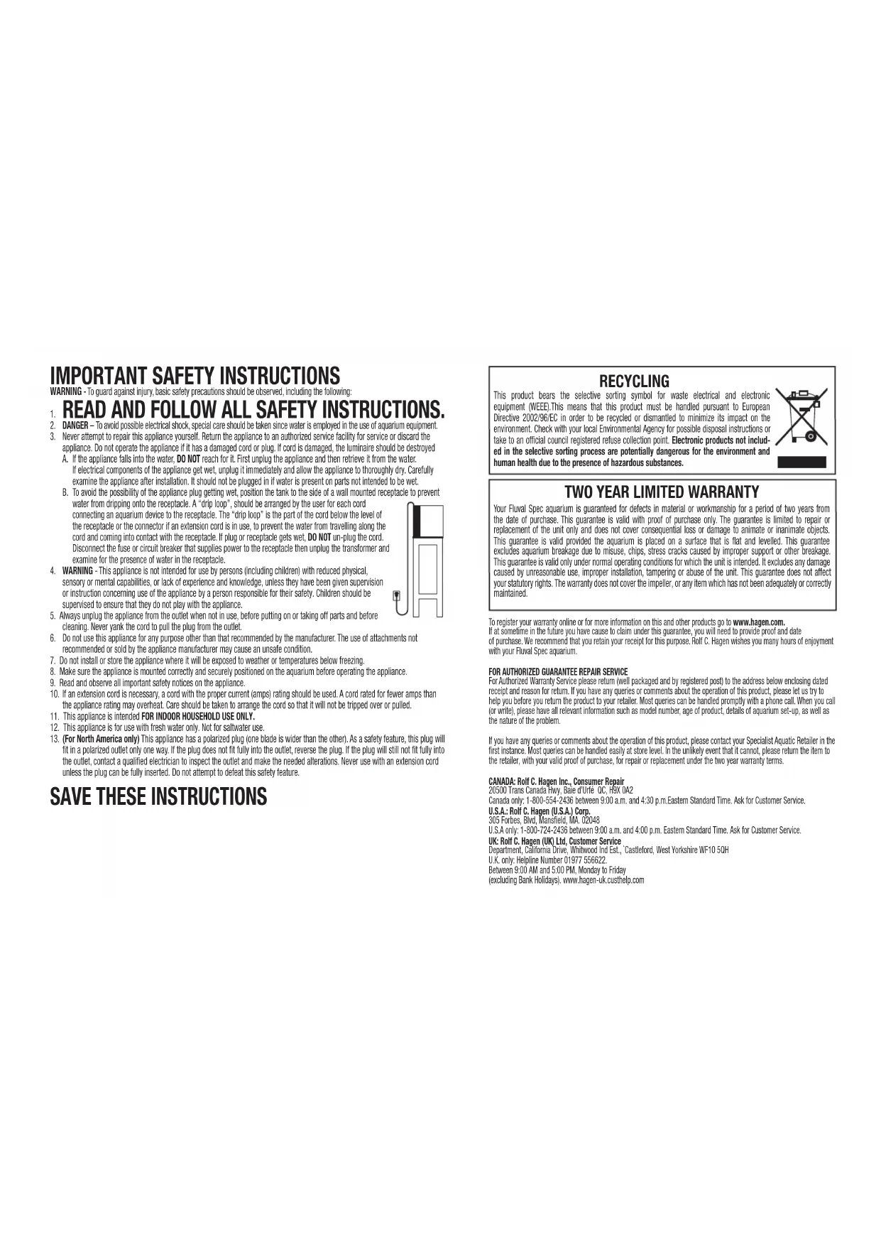 Votre aquarium Spec Fluval est garanti contre tout defaut de matieriaux et de fabrication pour une periode de deux ans a partir de la date d'achat. Cette garantie est valide accompagnerd a une preue d'achat seul. La garantie se limite a la réparation ou au replACEMENT de l'article seulement et ne s'applique pas aux pertes ni aux dommages indirects causés aux objets animés ou inanimés. Cette garantie est valide a condition que I'aquarium soit déposé sur une surface plate et de niveau. Cette garantie exclut le bris de I'aquarium a la suite d'un mauvais usage, de fragments et de fissures de contrainte causesp a un support inadqueau ou tout autre brise. cette garantie est valide seulment dans les conditions normales d'utilisation pour lesquelles le produit a ete concu. Elle exclut tout dommage resultant d'un usage inapproprié, d'une mauvaise installation, d'une modification ou d'un usage excessif. cette garantie ne porte pas atteinte a vos droits prevus par la loi. La garantie ne couve pas I'impulseur ni tout autre article qui n'a pas ete entretenu de maniere adequate.