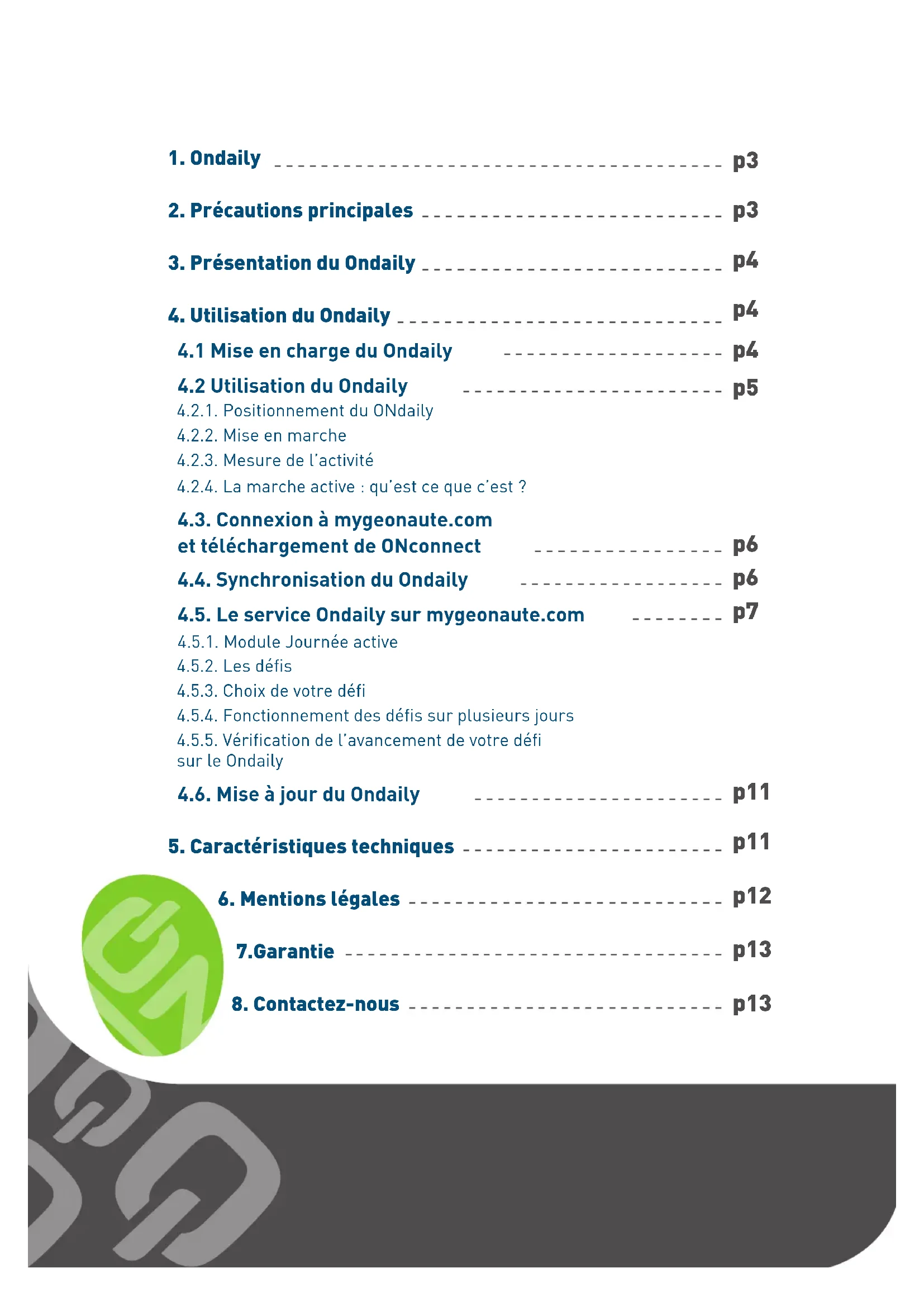 p11 p11 p12 p13 p133 Le ONdaily est un compteur d’activité qui vous accompagne discrètement tout au long de la journée en mesurant votre activité de marche quotidienne (nombre de pas, distance, calories dépensées). Grâce à son service exclusif sur mygeonaute le ONdaily transforme les données récoltées durant son utilisation en accomplis réels sportifs, caloriques, etc... Ces accomplis se présentent sous forme de défis que le ONdaily vous propose de relever chaque jour ! Ne pas le mettre en machine : surveillez vos poches !Ne pas utiliser le ONdaily en tant que clé USBNe pas supprimer les fichiers se trouvant dans le ONdailyNe pas formater et/ou partitionner le ONdaily
