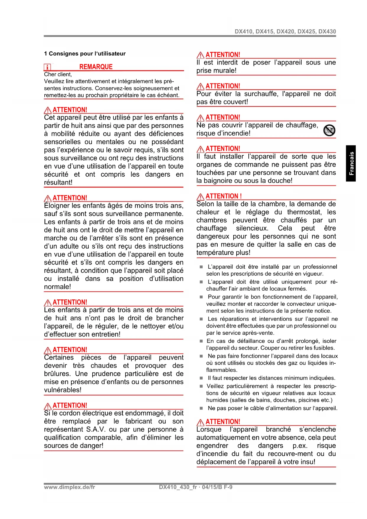 Is the fuse in the fuse box switched on? If you cannot remedy the fault, please contact your electrical retailer. To process your order, please state the device type as well as its production number (E No.) and manufacturing date (FD). This information is listed on the type plate. 8Cleaning To clean the device, first disconnect it from the mains and allow it to cool down. Clean the outside of the unit using a soft, damp cloth. Do not use scouring powder or furniture polish as this may damage the surface. Dust which gathers inside the device can be removed from the outside using a vacuum cleaner. 9 Warranty Please contact your local dealer for information on the warranty conditions. The warranty is not valid without a sales receipt marked with the date of purchase. 10 Note on Disposal Do not dispose of the unit with general house- hold waste. The device must be taken to a local waste disposal plant. Phone number: +49 9221 709-564 Fax: +49 9221 709589 E-Mail: 09221709589@dimplex.de www.dimplex.de/enwww.dimplex.de/fr DX410_430_fr · 04/15/B F-9 Francais DX410, DX415, DX420, DX425, DX430 1 Consignes pour l‘utilisateur RemarqueREMARQUE Cher client, Veuillez lire attentivement et intégralement les pré- sentes instructions. Conservez-les soigneusement et remettez-les au prochain propriétaire le cas échéant. ATTENTION! Cet appareil peut être utilisé par les enfants à partir de huit ans ainsi que par des personnes à mobilité réduite ou ayant des déficiences sensorielles ou mentales ou ne possédant pas l’expérience ou le savoir requis, s’ils sont sous surveillance ou ont reçu des instructions en vue d’une utilisation de l’appareil en toute sécurité et ont compris les dangers en résultant! ATTENTION! Éloigner les enfants âgés de moins trois ans, sauf s’ils sont sous surveillance permanente. Les enfants à partir de trois ans et de moins de huit ans ont le droit de mettre l’appareil en marche ou de l’arrêter s’ils sont en présence d’un adulte ou s’ils ont reçu des instructions en vue d’une utilisation de l’appareil en toute sécurité et s’ils ont compris les dangers en résultant, à condition que l’appareil soit placé ou installé dans sa position d’utilisation normale! ATTENTION! Les enfants à partir de trois ans et de moins de huit ans n’ont pas le droit de brancher l’appareil, de le réguler, de le nettoyer et/ou d’effectuer son entretien! ATTENTION! Certaines pièces de l’appareil peuvent devenir très chaudes et provoquer des brûlures. Une prudence particulière est de mise en présence d’enfants ou de personnes vulnérables! ATTENTION! Si le cordon électrique est endommagé, il doit être remplacé par le fabricant ou son représentant S.A.V. ou par une personne à qualification comparable, afin d’éliminer les sources de danger! ATTENTION! Il est interdit de poser l’appareil sous une prise murale! ATTENTION! Pour éviter la surchauffe, l'appareil ne doit pas être couvert! ATTENTION! Ne pas couvrir l’appareil de chauffage, risque d’incendie! ATTENTION! Il faut installer l’appareil de sorte que les organes de commande ne puissent pas être touchées par une personne se trouvant dans la baignoire ou sous la douche! ATTENTION ! Selon la taille de la chambre, la demande de chaleur et le réglage du thermostat, les chambres peuvent être chauffés par un chauffage silencieux. Cela peut être dangereux pour les personnes qui ne sont pas en mesure de quitter la salle en cas de température plus! L’appareil doit être installé par un professionnel selon les prescriptions de sécurité en vigueur. L’appareil doit être utilisé uniquement pour ré- chauffer l’air ambiant de locaux fermés. Pour garantir le bon fonctionnement de l’appareil, veuillez monter et raccorder le convecteur unique- ment selon les instructions de la présente notice. Les réparations et interventions sur l’appareil ne doivent être effectuées que par un professionnel ou par le service après-vente. En cas de défaillance ou d’arrêt prolongé, isoler l’appareil du secteur. Couper ou retirer les fusibles. Ne pas faire fonctionner l’appareil dans des locaux où sont utilisés ou stockés des gaz ou liquides in- flammables. Il faut respecter les distances minimum indiquées. Veillez particulièrement à respecter les prescrip- tions de sécurité en vigueur relatives aux locaux humides (salles de bains, douches, piscines etc.) Ne pas poser le câble d’alimentation sur l‘appareil. ATTENTION! Lorsque l’appareil branché s’enclenche automatiquement en votre absence, cela peut engendrer des dangers p.ex. risque d’incendie du fait du recouvre-ment ou du déplacement de l’appareil à votre insu!F-10 DX410_430_fr · 04/15/B www.dimplex.de/fr Francais DX410, DX415, DX420, DX425, DX430 ATTENTION! L’installation électrique fixe doit être pourvue d’un dispositif de coupure ayant une distance d’ouverture des contacts d‘au moins 3 mm sur chaque pôle (coupe-circuit automatique par exemple) ATTENTION! Périphérique non près de rideaux, tentures et autres matériaux inflammables attachés! 2 Caractéristiques techniques Tension de raccordement: 1/N/PE~, 230 V, 50 Hz Degré de protection: IP20 Classe de protection: I (avec conducteur de protection) 3 Installation, montage L'appareil de chauffage ne doit être installé que sur une surface plane et horizontale (comme représenté ci- dessous) Il est interdit de l'utiliser sur des tapis à poils longs. Lors de l'installation, prendre garde aux objets inflammables. Il est interdit de monter ou d'installer l'appareil en des- sous d'une prise de courant murale. Respecter les écartements minimaux. Respecter en outre un écartement minimal de 500 mm entre la face frontale de l'appareil et des objets inflam- mables, tels que rideaux, serviettes ou textiles sen- sibles à la chaleur. La fiche de l'appareil doit être accessible une fois l’ap- pareil monté. L'appareil de chauffage