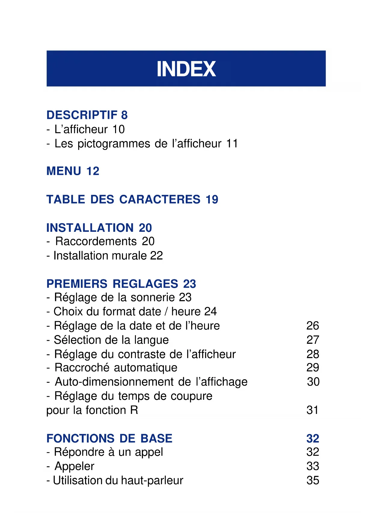 INSTALLATION 20 - Raccordements 20 - Installation murale 22 PREMIERS REGLAGES 23 - Réglage de la sonnerie 23 - Choix du format date / heure 24 - Réglage de la date et de l’heure 26 - Sélection de la langue 27 - Réglage du contraste de l’afficheur 28 - Raccroché automatique 29 - Auto-dimensionnement de l’affichage 30 - Réglage du temps de coupure pour la fonction R 31