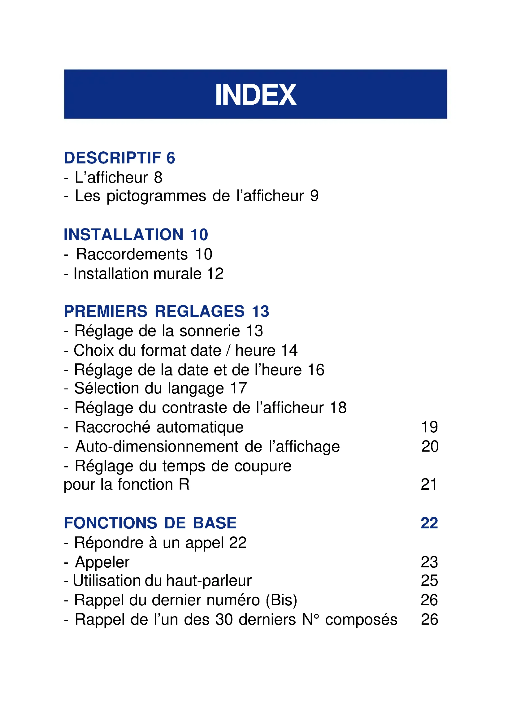 - Répondre à un appel 22 - Appeler 23 - Utilisation du haut-parleur 25 - Rappel du dernier numéro (Bis) 26 - Rappel de l’un des 30 derniers N° composés 26 INDEX- Effacer un des 30 derniers numéros composés 27 - Fonction Secret 28 - Touches R, * et # 28 - Mémoriser un numéro de téléphone 29 - Appel d’un numéro en mémoire 30