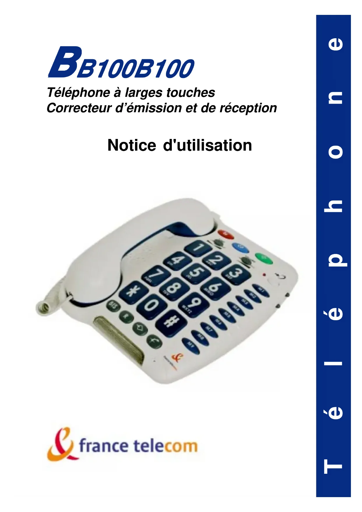 B100B100 B100B100 B100 Téléphone à larges touches Correcteur d’émission et de réception Notice d'utilisationDESCRIPTIF Rappel du dernier numéro composé Mise en mémoire 3 mémoires d’urgence Activation automatique de la correction d’écoute au décroché Réglage de la tonalité de réception Réglage du volume de réception Connecteur du cordon combiné Ergot à retourner pour maintenir le téléphone en position muraleSecret d’appel Flash lumineux de sonnerie Mémoires directes Réglage du volume d’émission Réglage du niveau de sonnerie Connecteur de ligne Activation de la correction de tonalité et de volume de réception Voyant du correcteur de réceptionCordon du combiné Prise téléphonique Cordon de ligne Ouvertures pour vis de position murale Répertoire INSTALLATION