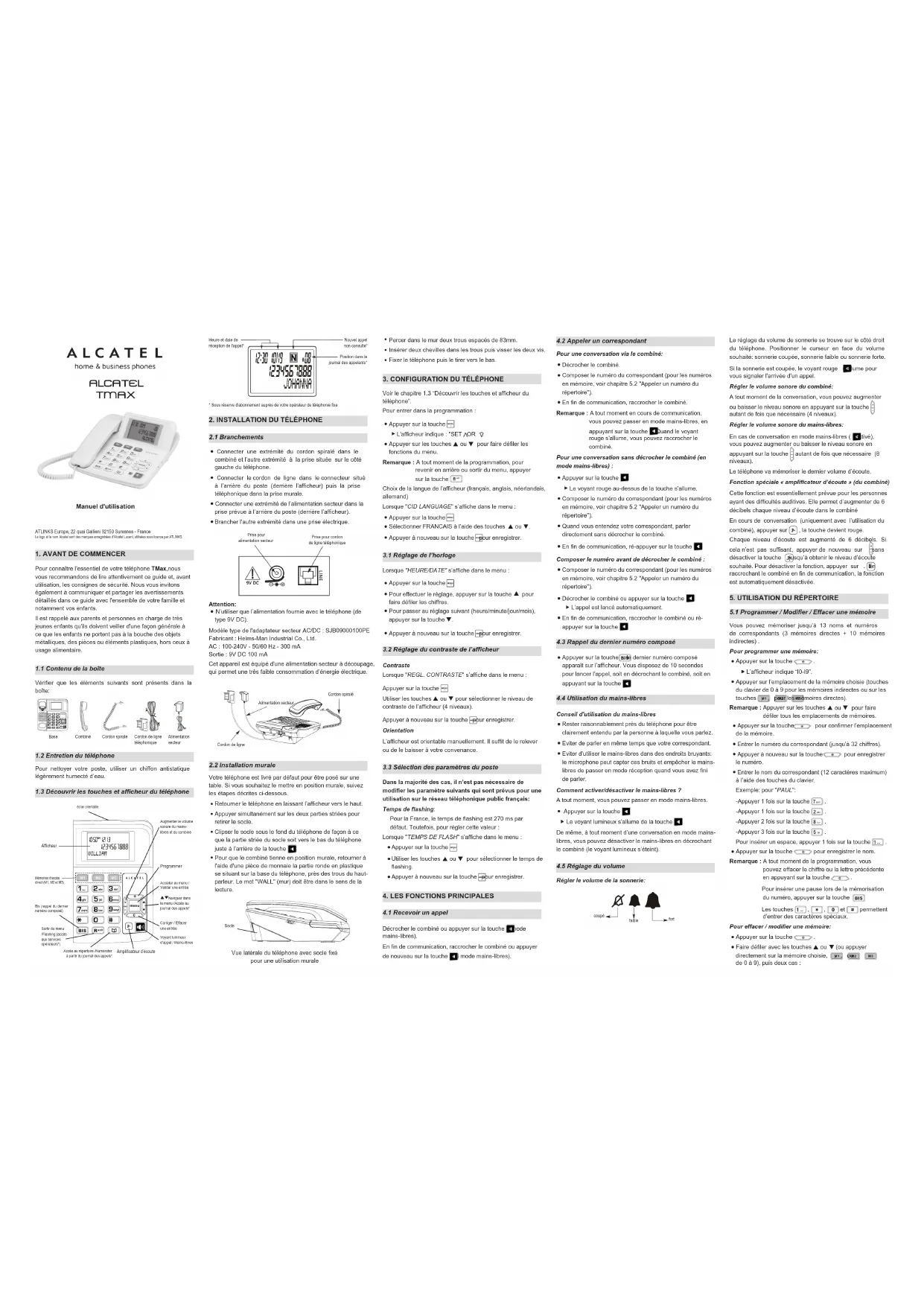 En n de communication, raccrocher le combiné ou ré- appuyer sur la touche . Nouvel appel non consulté*Position dans le journal des appelants*Heure et date de réception de l'appel** Sous réserve d'abonnement auprès de votre opérateur de téléphonie xe Modèle type de l'adaptateur secteur AC/DC : SJB09000100PE Fabricant : Helms-Man Industrial Co., Ltd. AC : 100-240V - 50/60 Hz - 300 mA Sortie : 9V DC 100 mA Cet appareil est équipé d'une alimentation secteur à découpage, qui permet une très faible consommation d’énergie électrique.