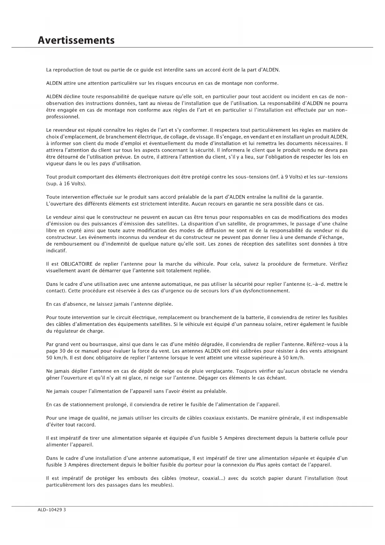 Attention : Toute intervention sans accord écrit de la part de ALDEN SAS entraîne de plein droit la nullité de la garantie. Le client et l'acheteur ne pourraient prétendre à aucune indemnité de quelque nature qu'elle soit pour démontage, remontage ou privation d'usage inférieure à 30 jours. ALDEN SAS ne peut être tenue pour responsable d'incidents ou de dommages quelconques en cas de montage non conforme aux recommandations de ALDEN SAS. Il est rappelé que toute installation électrique doit être protégée par un fusible adéquat.