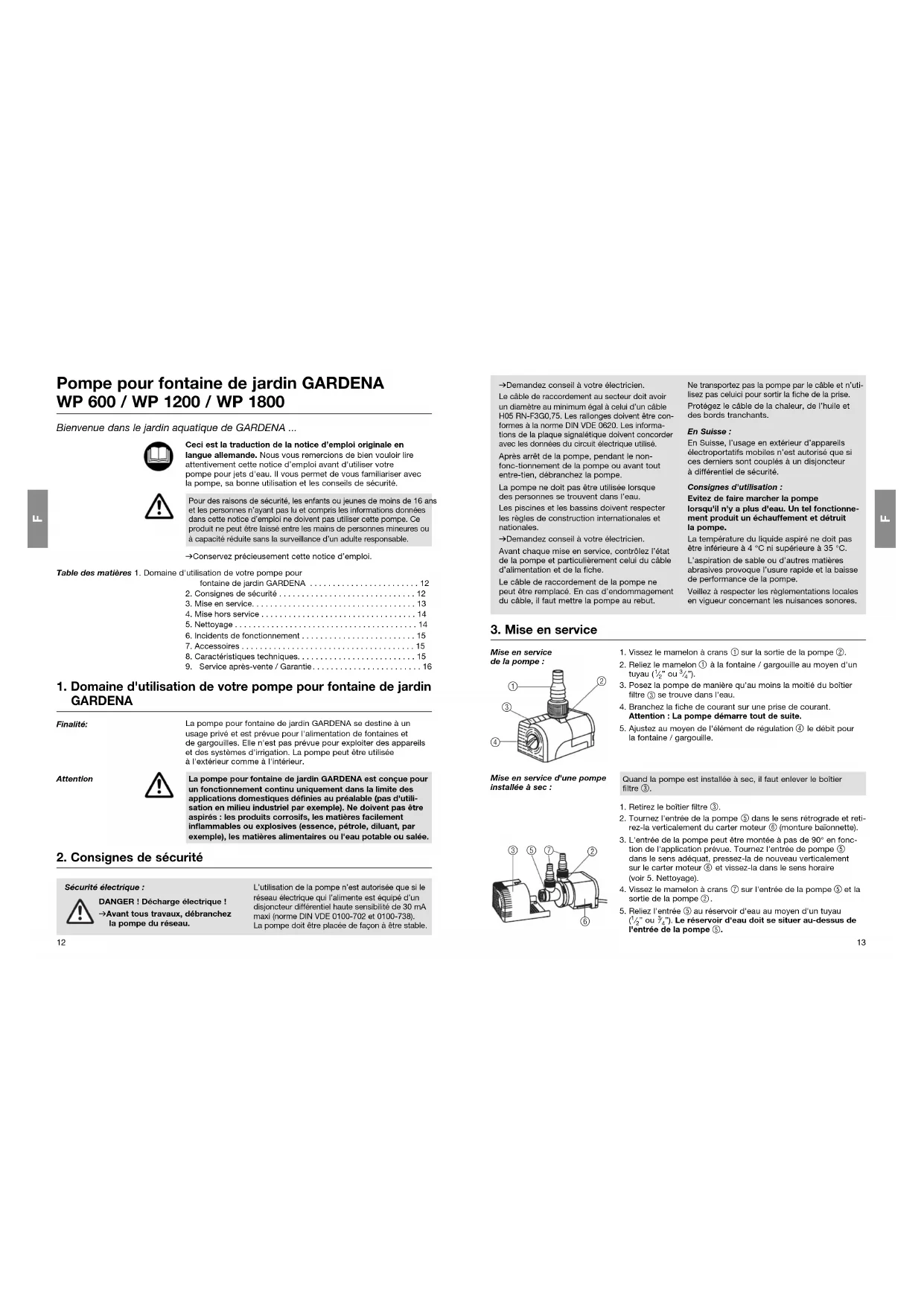 - Ceci est la traduction de la notice d’emploi originale en langue allemande. Nous vous remercions de bien vouloir lire attentivement cette notice d’emploi avant d'utiliser votre pompe pour jets d'eau. Il vous permet de vous familiariser avec la pompe, sa bonne utilisation et les conseils de sécurité. v Conservez précieusement cette notice d’emploi. Table des matières 1. Domaine d'utilisation de votre pompe pour fontaine de jardin GARDENA p. 12
