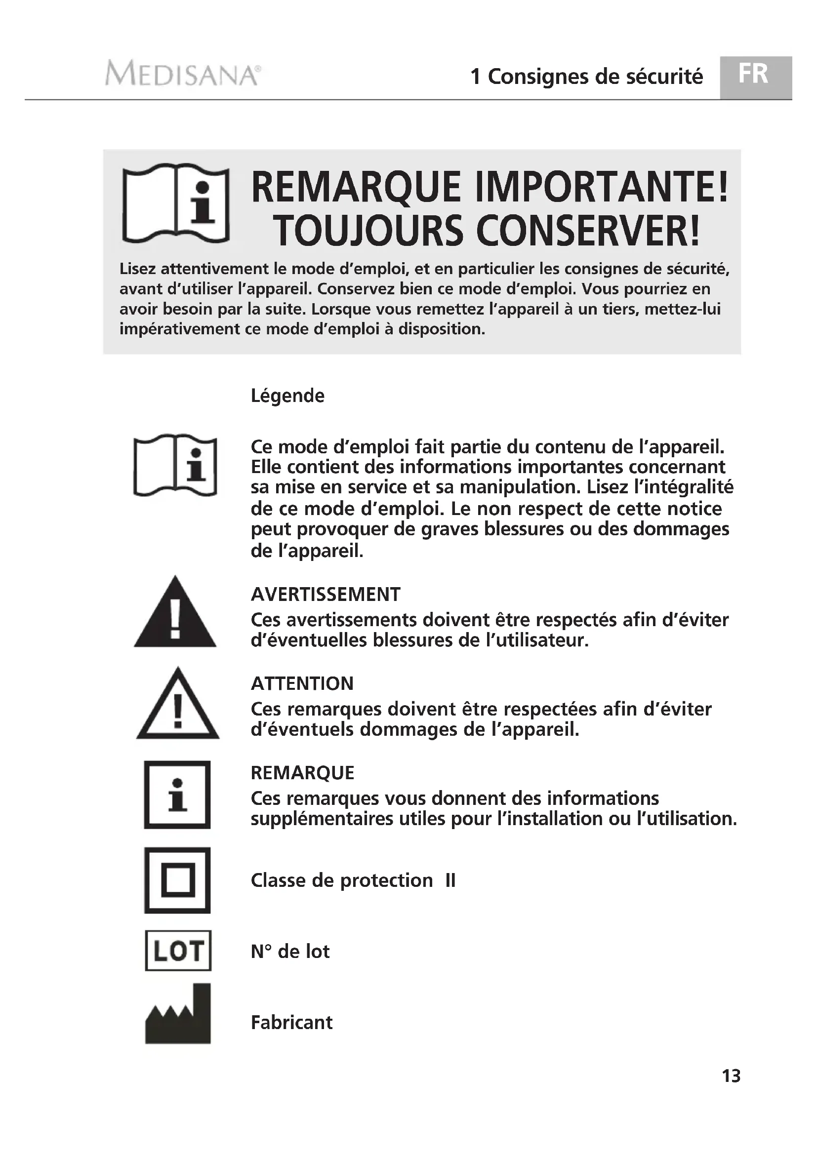 - Une garantie de trois ans à compter de la date d'achat est accordée sur les produits MEDISANA. En cas d'intervention de la garantie, la date d'achat doit être prouvée ennantant le justificatif d'achat ou la facture.