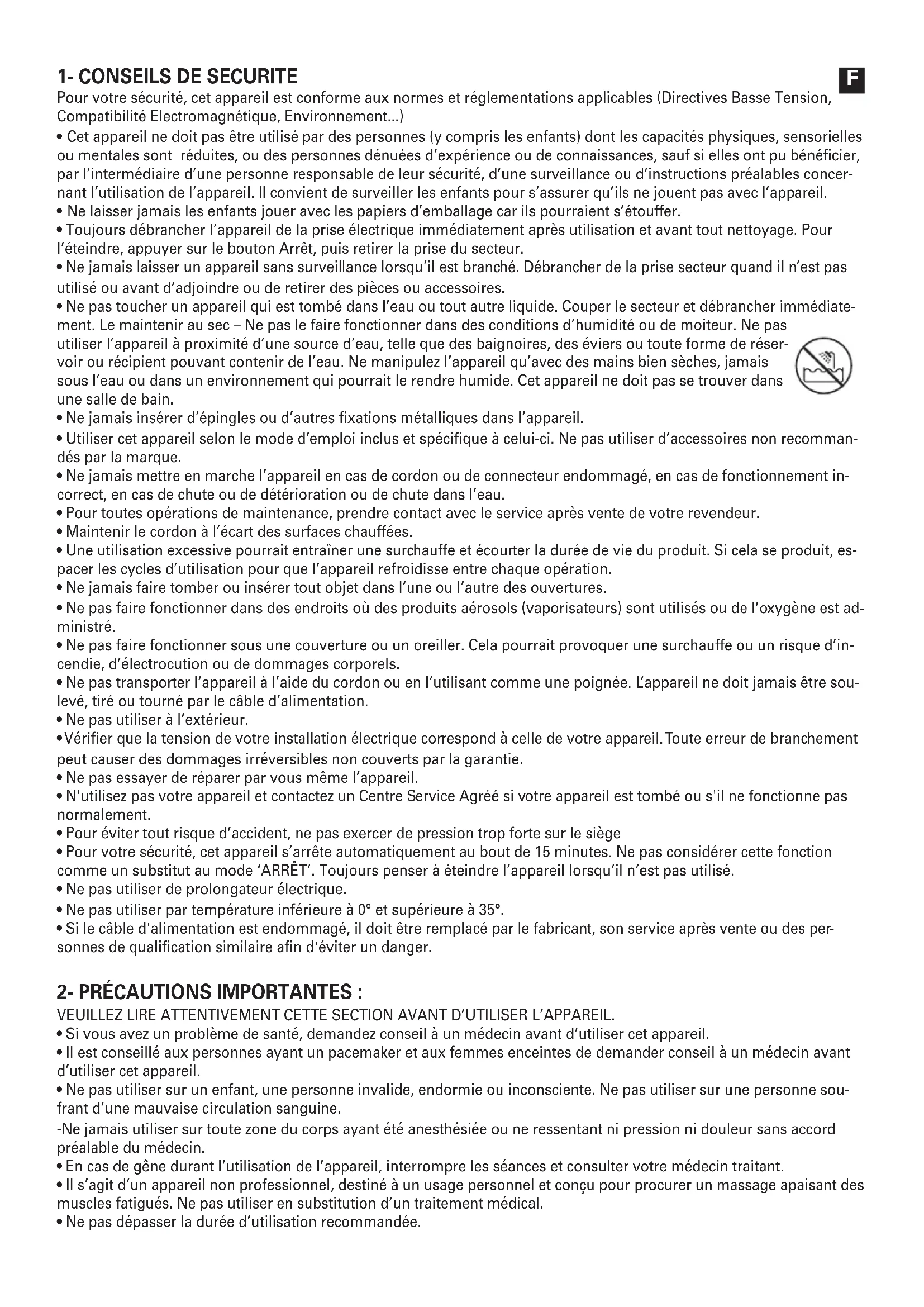 -Ne jamais utiliser sur toute zone du corps ayant été anesthésiée ou ne ressentant ni pression ni douleur sans accord préalable du médecin. - En cas de gène durant l'utilisation de l'appareil, interrompre les séances et consulter votre médecin traitant.