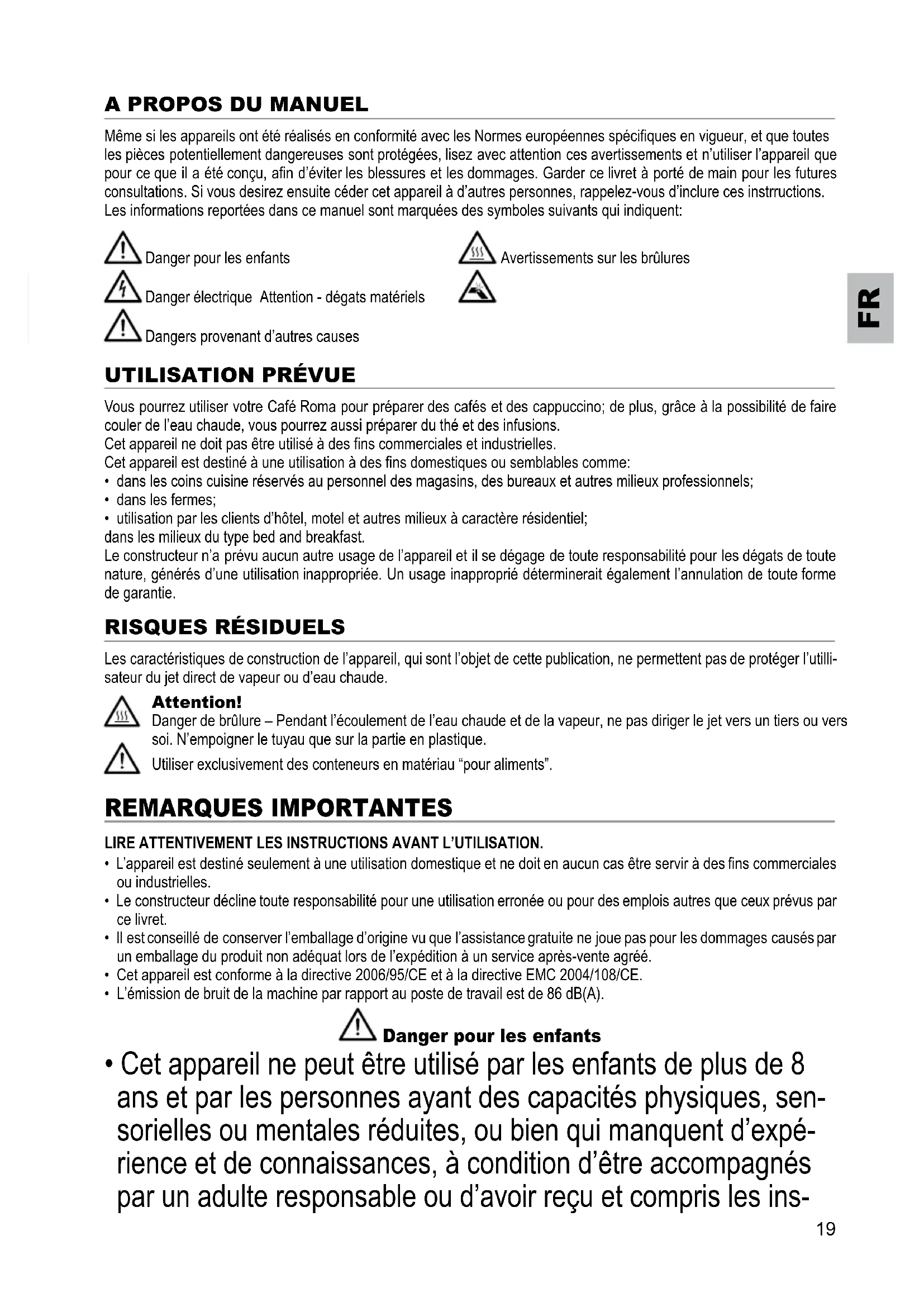 Même si les appareils ont été réalisés en conformité avec les Normes européennes spéciques en vigueur, et que toutes les pièces potentiellement dangereuses sont protégées, lisez avec attention ces avertissements et n’utiliser l’appareil que pour ce que il a été conçu, an d’éviter les blessures et les dommages. Garder ce livret à porté de main pour les futures consultations. Si vous desirez ensuite céder cet appareil à d’autres personnes, rappelez-vous d’inclure ces instrructions. Les informations reportées dans ce manuel sont marquées des symboles suivants qui indiquent: Danger pour les enfants Avertissements sur les brûlures Danger électrique Attention - dégats matériels Dangers provenant d’autres causes