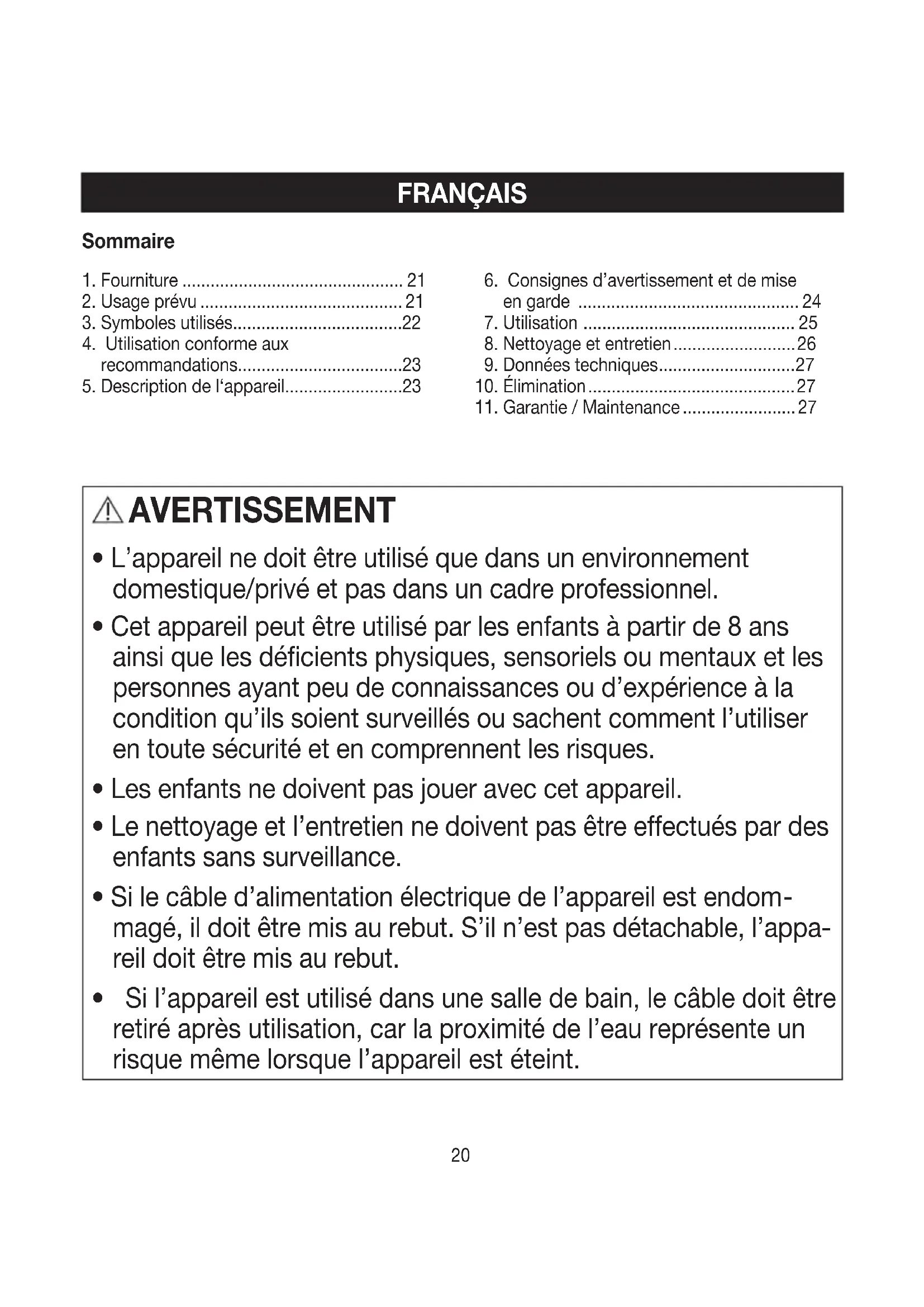 - Cet appareil peut être utilisé par les enfants à partir de 8ans ainsi que les déficients physiques, sensoriels ou mentaux et les personnes ayant peu de connaissances ou d’expérience à la condition qu’ils soient surveillés ou sachent comment l’utiliser en toute sécurité et en comprennent les risques.