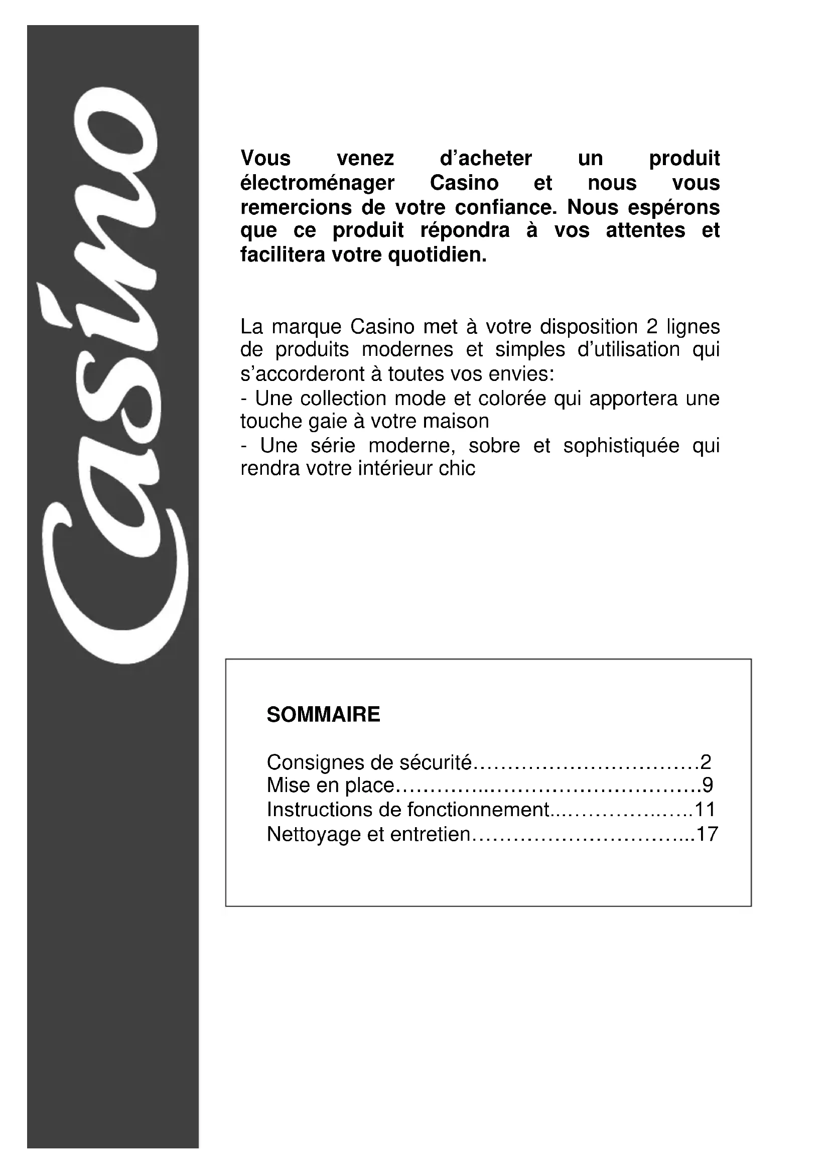 Vous venez d'acheter un produit électroménager Casino et nous vous remercions de votre confiance. Nous espérons que ce produit répondra à vos attentes et facilitera votre quotidien.