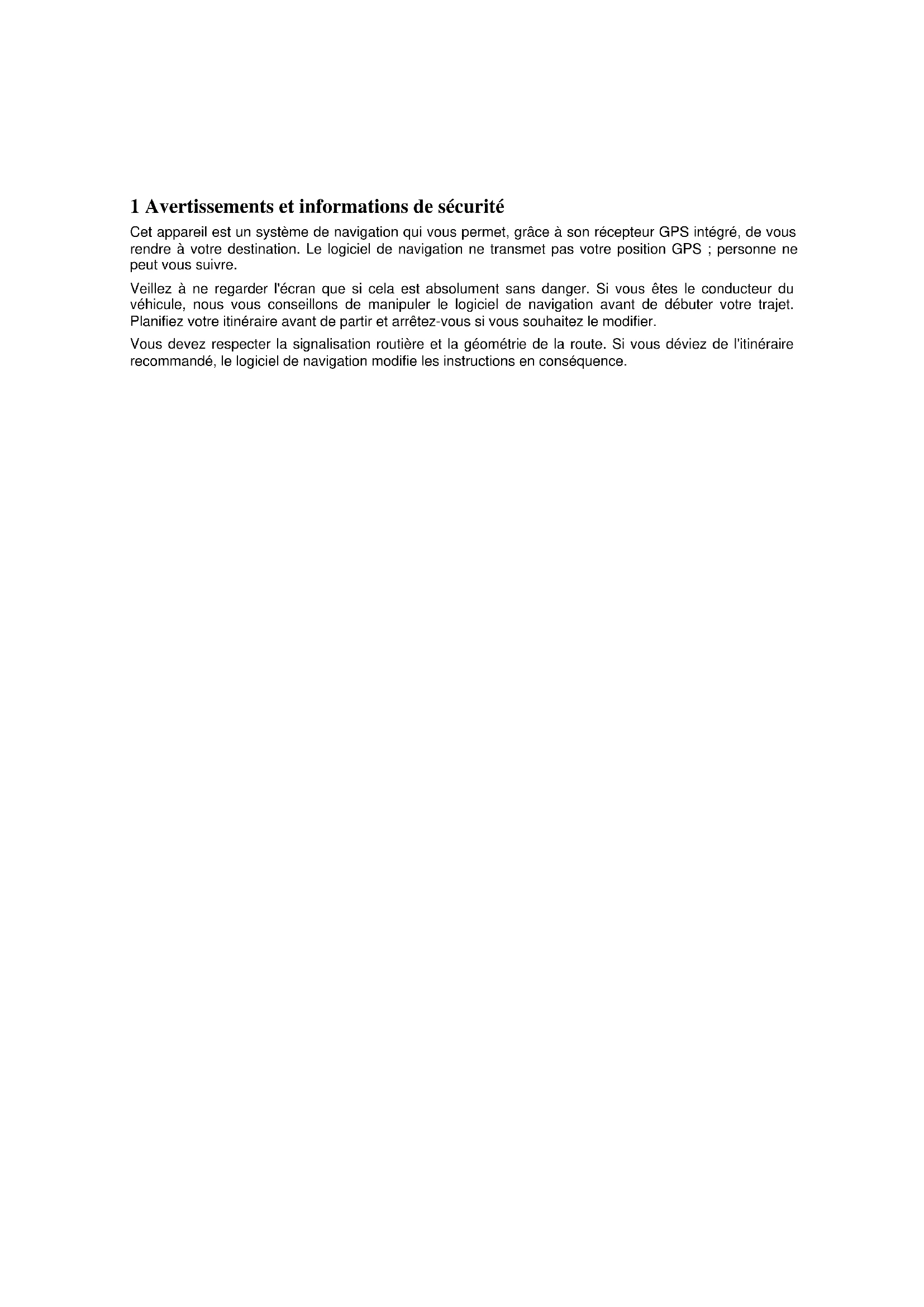 - 6 Note sur le droit d'auteur Avertissements et informations de sécurité Cet appareil est un système de navigation qui vous permet, grâce à son récepteur GPS intégré, de vous rendre à votre destination. Le logiciel de navigation ne transmet pas votre position GPS ; personne ne peut vous suivre. Veillez à ne regarder l'écran que si cela est absolument sans danger. Si vous êtes le conducteur du véhicule, nous vous conseillons de manipuler le logiciel de navigation avant de débuter votre trajet. Planifiez votre itinéraire avant de partir et arrêtez-vous si vous souhaitez le modifier. Vous devez respecter la signalisation routière et la géométrie de la route. Si vous déviez de l'itinéraire recommandé, le logiciel de navigation modifie les instructions en conséquence.2 Démarrage Le logiciel de navigation est optimisé pour une utilisation en voiture ou piétonne. Vous n'avez pas besoin de stylet pour l'utiliser. Vous l'utiliserez facilement en touchant du bout des doigts les boutons de l'écran et la carte. S'il s'agit d'une première utilisation, un processus de configuration initiale démarrera automatiquement. Procédez comme suit : p. 1191