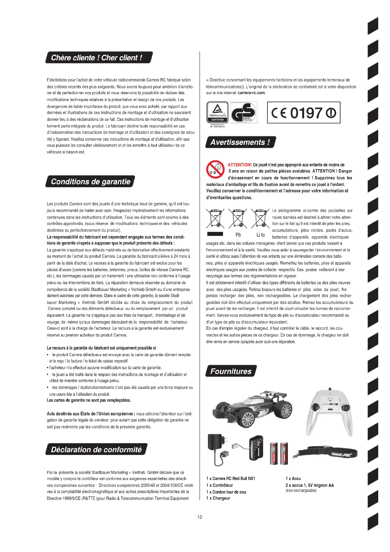 Clean the Carrera RC car after use. Attach the lanyard to the eyelet on the controller and let the controller hang from your neck. CAUTION! Danger of strangulation! The joysticks are removable. Alternatively, the vehicle can be controlled with a rocker. The joysticks can be stored in the spe- cial compartment at the back of the controller.12 ALKALINE ALKALINE Chère cliente ! Cher client ! Félicitations pour l’achat de votre véhicule radiocommandé Carrera RC fabriqué selon des critères récents des plus exigeants. Nous avons toujours pour ambition d’amélio- rer et de perfectionner nos produits et nous réservons la possibilité de réaliser des modifications techniques relatives à la présentation et design de nos produits. Les divergences de faible importance du produit, que vous avez acheté, par rapport aux données et illustrations de ces instructions de montage et d’utilisation ne sauraient donner lieu à des réclamations de ce fait. Ces instructions de montage et d’utilisation forment partie intégrale du produit. Le fabricant décline toute responsabilité en cas d’inobservation des instructions de montage et d’utilisation et des consignes de sécu- rité y figurant. Veuillez conserver ces instructions de montage et d’utilisation, afin que vous puissiez les consulter ultérieurement et et les remettre à tout utilisateur de ce véhicule si besoin est. Conditions de garantie Les produits Carrera sont des jouets d’une technique haut de gamme, qu’il est tou- jours recommandé de traiter avec soin. Respectez impérativement les informations contenues dans les instructions d’utilisation. Tous les éléments sont soumis à des contrôles approfondis (sous réserve de modifications techniques et des véhicules destinées au perfectionnement du produit). La responsabilité du fabricant est cependant engagée aux termes des condi- tions de garantie ci-après à supposer que le produit présente des défauts : La garantie s’applique aux défauts matériels ou de fabrication effectivement existants au moment de l’achat du produit Carrera. La garantie du fabricant s’élève à 24 mois à partir de la date d’achat. Le recours à la garantie du fabricant est exclue pour les pièces d’usure (comme les batteries, antennes, pneus, boîtes de vitesse Carrera RC, etc.), les dommages causés par un traitement / une utilisation non conforme à l’usage prévu ou les interventions de tiers. La réparation demeure réservée au domaine de compétence de la société Stadlbauer Marketing + Vertrieb GmbH ou d’une entreprise dûment autorisée par cette dernière. Dans le cadre de cette garantie, la société Stadl- bauer Marketing + Vertrieb GmbH décide au choix du remplacement du produit Carrera complet ou des éléments défectueux ou du remplacement par un produit équivalent. La garantie ne s’applique pas aux frais de transport, d’emballage et de voyage, de même qu’aux dommages découlant de la responsabilité de l’acheteur. Ceux-ci sont à la charge de l’acheteur. Le recours à la garantie est exclusivement réservé au premier acheteur du produit Carrera. Le recours à la garantie du fabricant est uniquement possible si